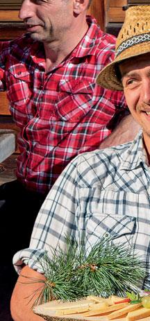 Almkas, auch als Variante Zirmkas: Gehackte Zirbennadeln sprenkeln den Teig des mit Zirbenöl eingeriebenen Laibs. Kräftig gereifter „Lissna Bergkas“. Dazu zwei strengere Sauermilch-Varianten: Die Ziggolan, deren Kegel die Lüsner schon ewig zu Hause drehten, und ein speckig-gelber Graukäse, der ähnlich dem Handkäse am besten „mit Musik“ mundet, also plus Essig und Zwiebeln.