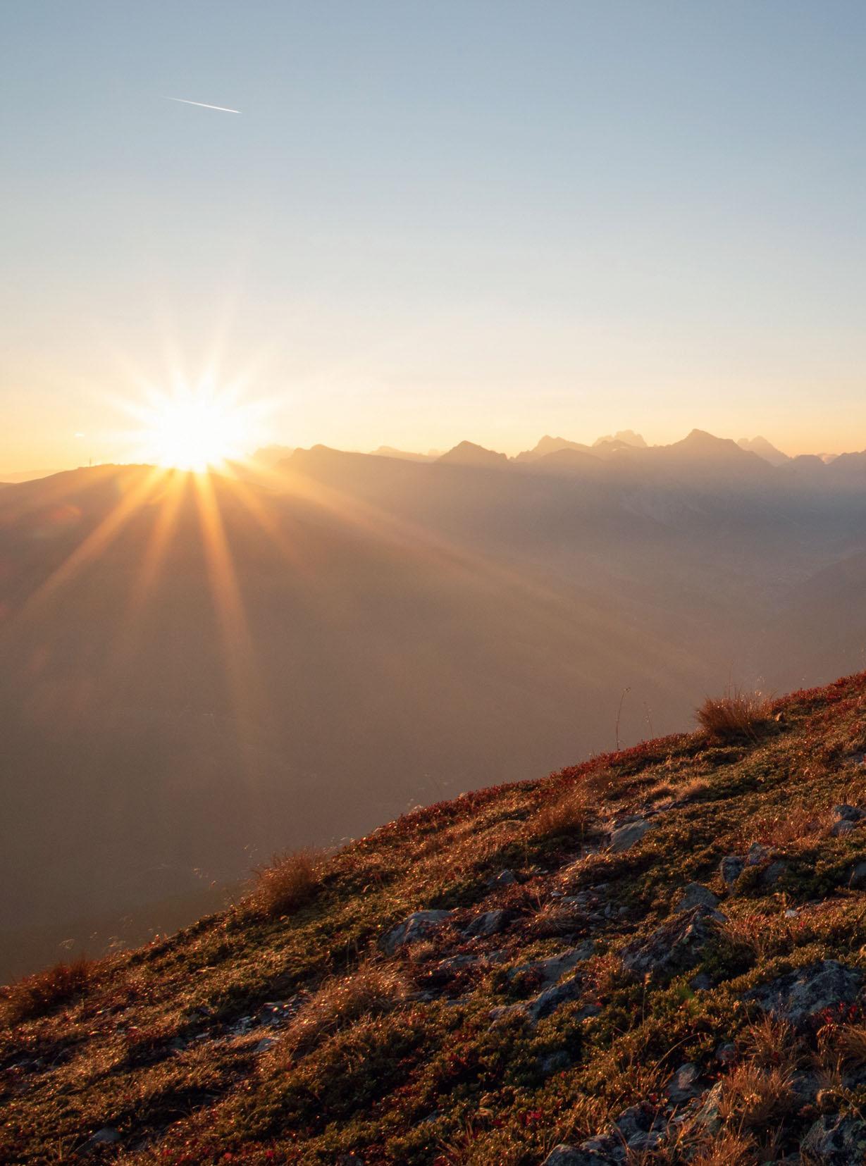 Seite. Es sind überwiegend Franzens Gäste. Doch auch andere Urlauber können sich über den Lüsner Tourismusverein der wöchentlichen Sonnenaufgangswanderung seines Hotels anschließen. Wanderführer Manni hat die Gruppe auf einer kürzeren Route hinaufbegleitet. Zum Glück geht kaum Wind. Es ist ungewöhnlich mild für einen frühen Morgen im Herbst, so frieren beim Warten auf das Schauspiel nicht gleich die Füße ein. Und dann: Genau über dem massigen runden Buckel des Kronplatzes taucht der Feuerball auf. Dunstschleier brechen die ersten Strahlen des Tages. Sie lassen Gräser und Zwergstäucher, ja sogar Steine und Gesichter magisch aufleuchten. Tautropfen glitzern. Ergriffenes Schweigen. Nun ist sie wachgeküsst, die Lüsner Alm.