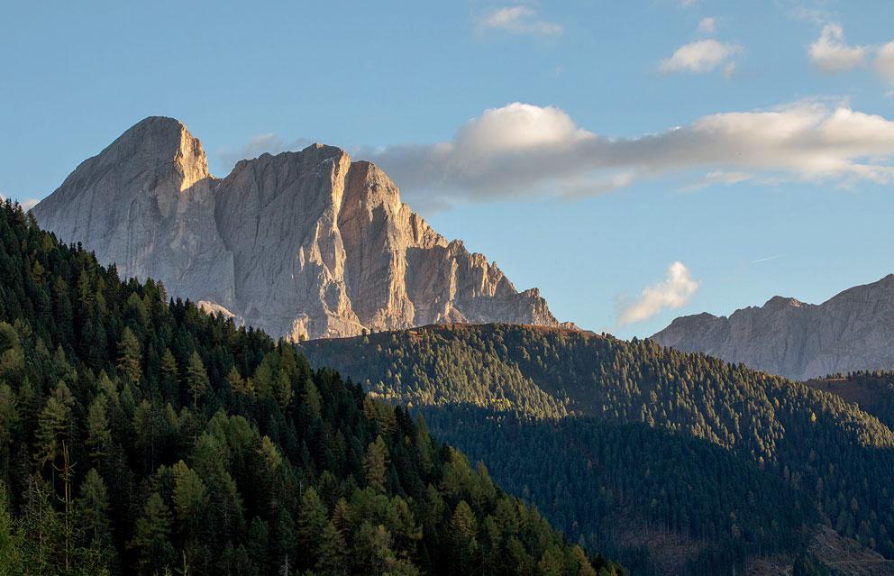 Fotogener Hausberg: Der Peitlerkofel macht immer eine gute Figur. Hier posiert der nordwestliche Eckpfeiler der Dolomiten vor der Maurerbergalm.