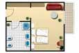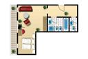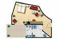 Letto matrimoniale, divano con poltrona, angolo soggiorno con panca, TV-LCD, radio, cassaforte, scrivania, minibar, telefono, wireless-internet, balcone. Vasca da bagno, asciugacapelli, bidet, WC, doccia, asciuga-asciugamani, specchio cosmetico, WC di servizio separato, arredamento accessibile ai portatori di handicap.