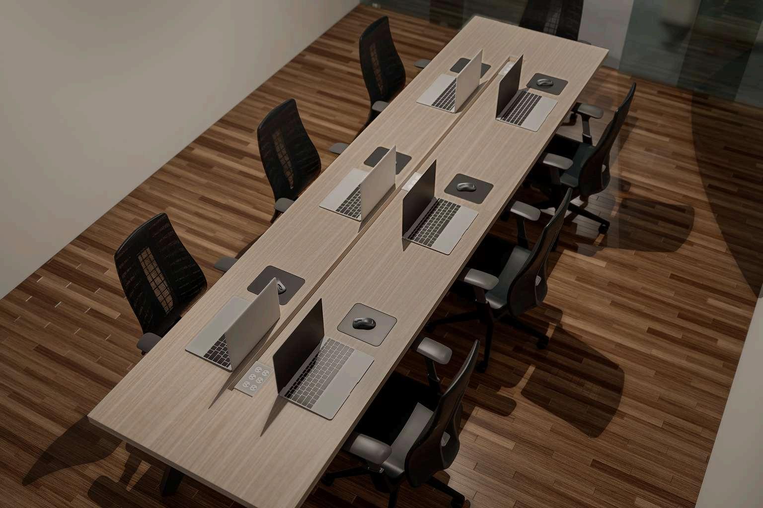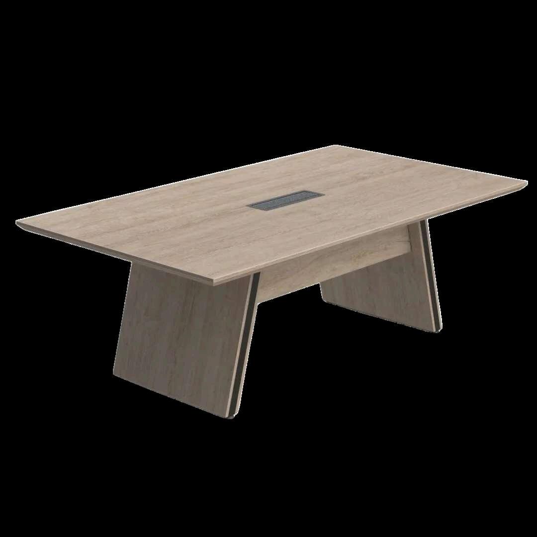 Mesadejuntasmodernacondiseñominimalistaylíneasrectas.Fabricadaenacabadomaderanaturalclara,transmite calidezyelegancia.Suestructurarobustaconpatasenformatrapezoidalofreceestabilidadypresenciavisual.Eltablero incluyeunaccesocentralparacableado,integrandofuncionalidadyordenenespaciosdereunióncontemporáneos.