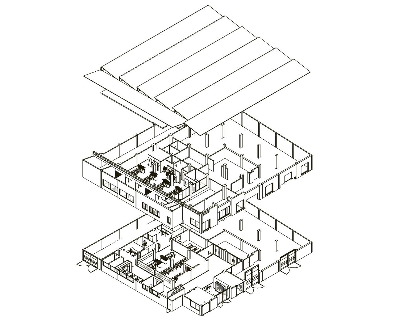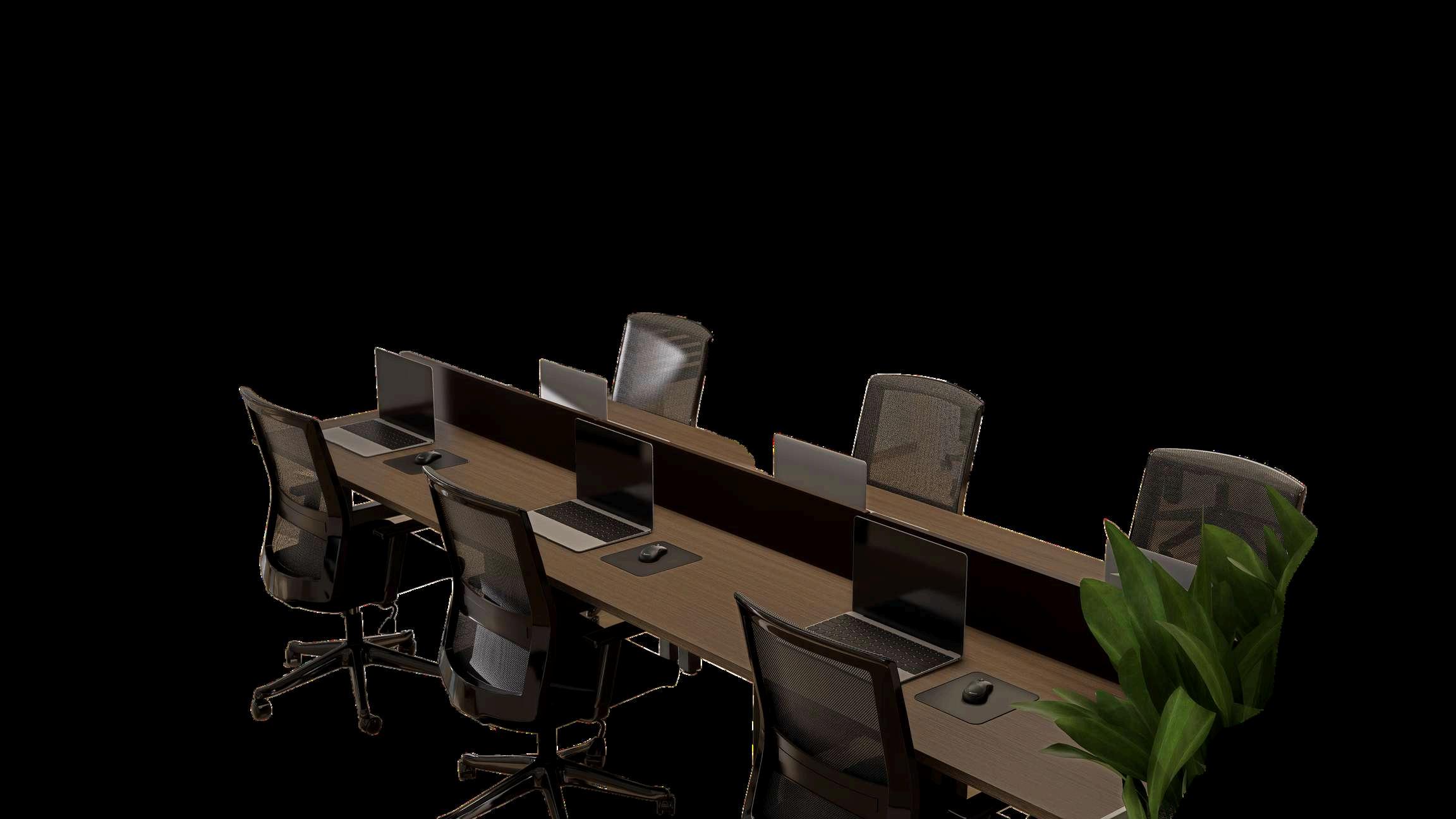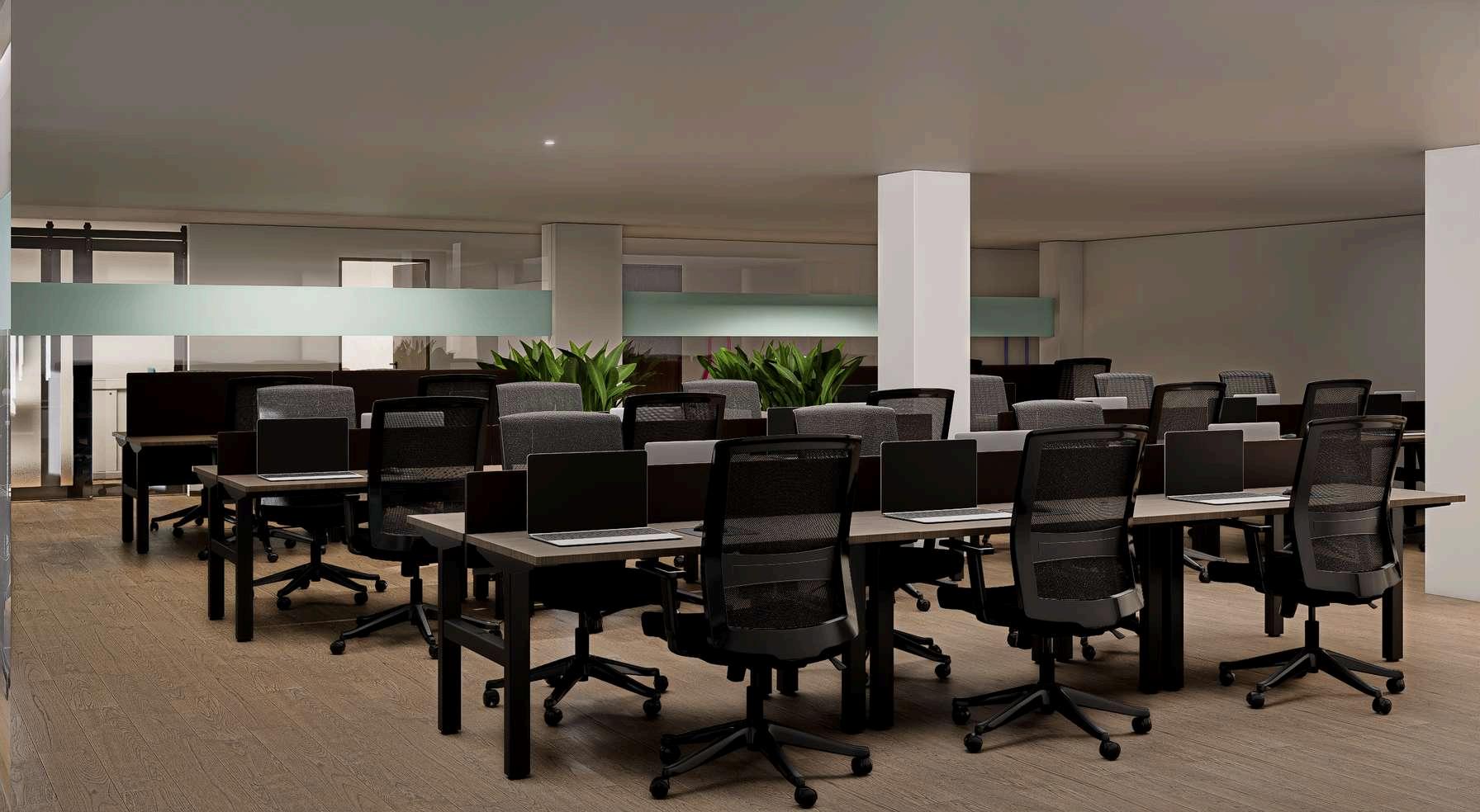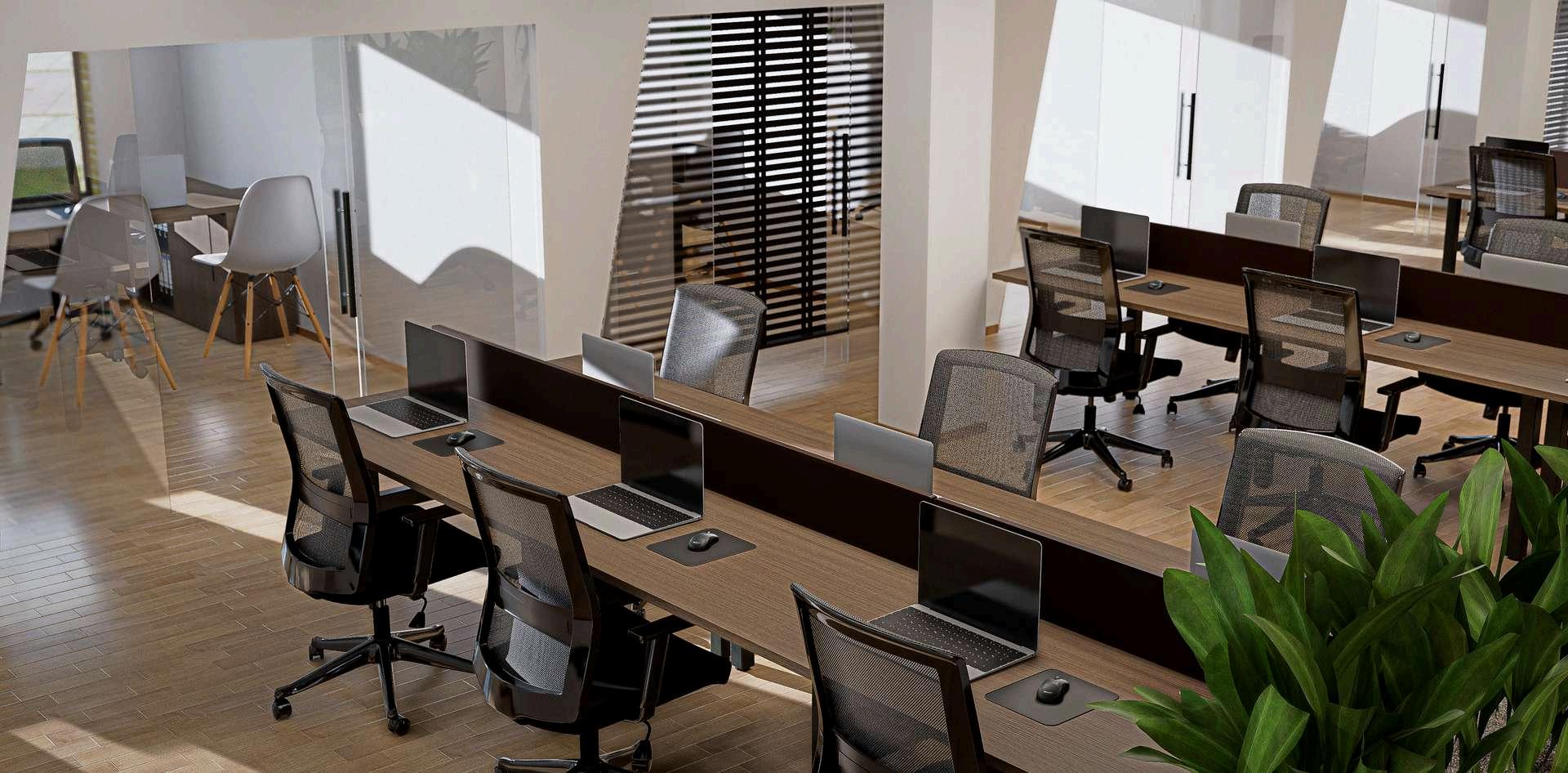 Elespaciomuestraunaoficinamodernayfuncionalconundiseñoabiertoquefavorecela colaboraciónyelordenvisual.Lasestacionesdetrabajoestánorganizadasenfilas linealesconescritorioscompartidos,separadosporpanelesdivisoriosbajosquebrindan privacidadsinperderlasensacióndeamplitud.