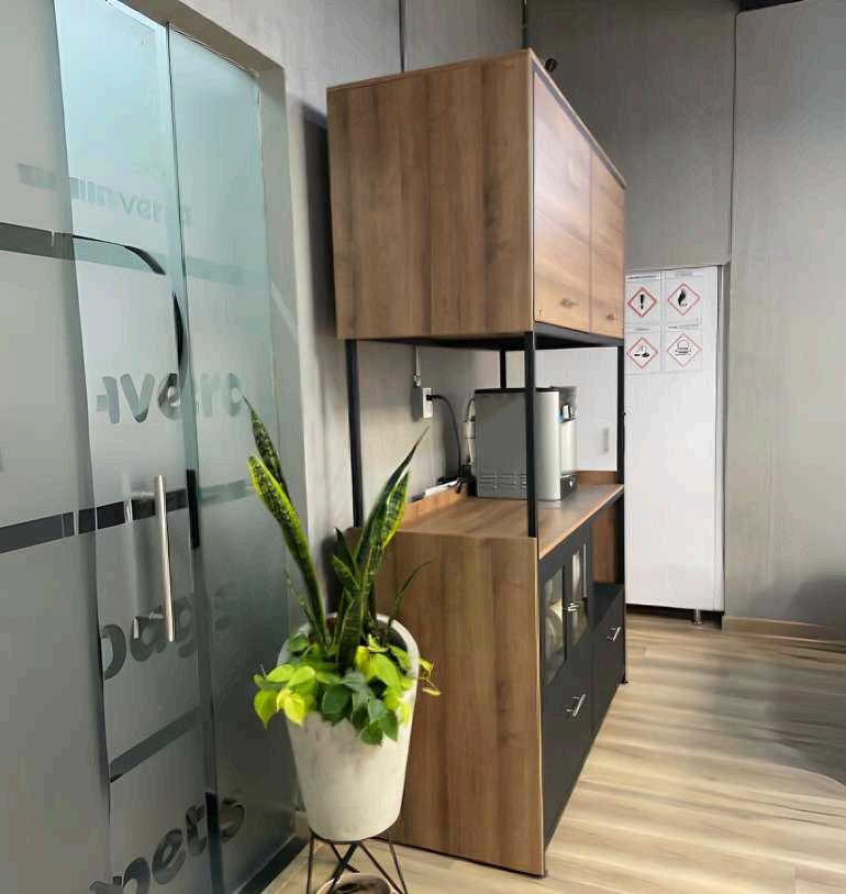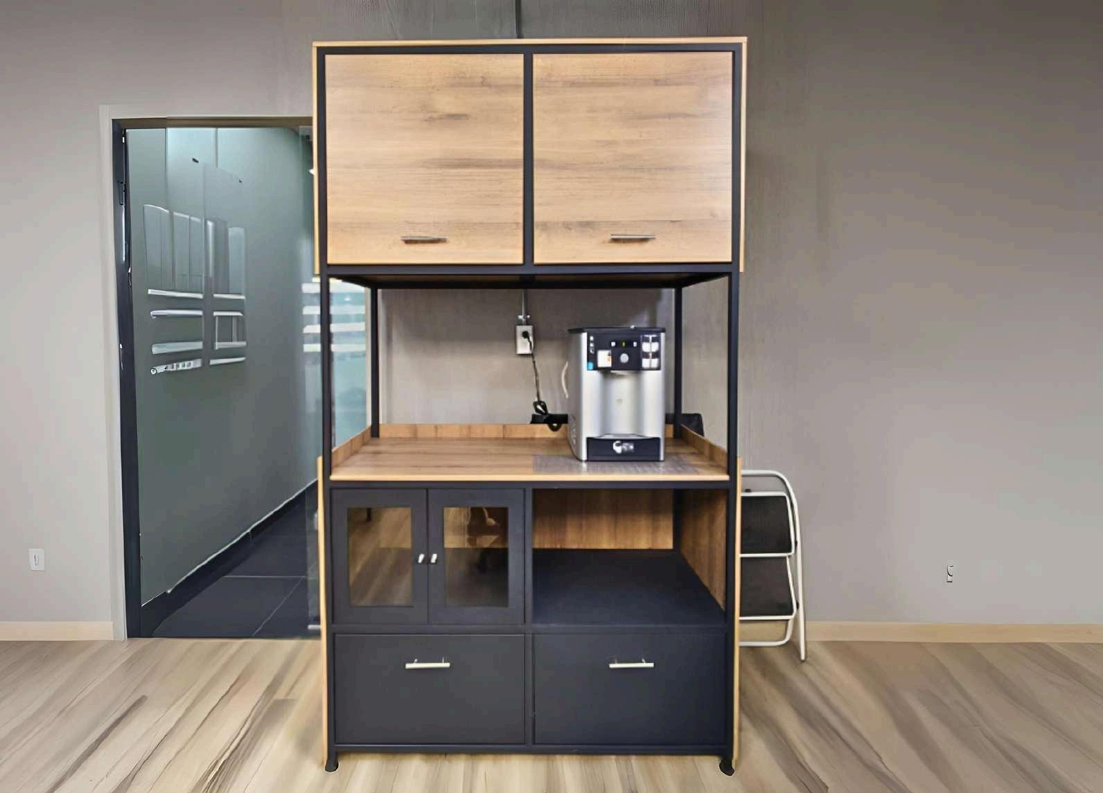 Estediseñocombinaestructurametálicayacabadosenmaderaclara,lograndounequilibrioentreestéticaindustrialycalideznatural.Su composiciónmodularintegrazonasdealmacenamientocerrado,repisasabiertasyunmóduloverticaltipovitrina,optimizandoelespacioyla funcionalidad.Ladistribuciónlinealylosdetallesennegrogeneranuncontrasteelegantequeaportacarácteryordenvisualalambiente.