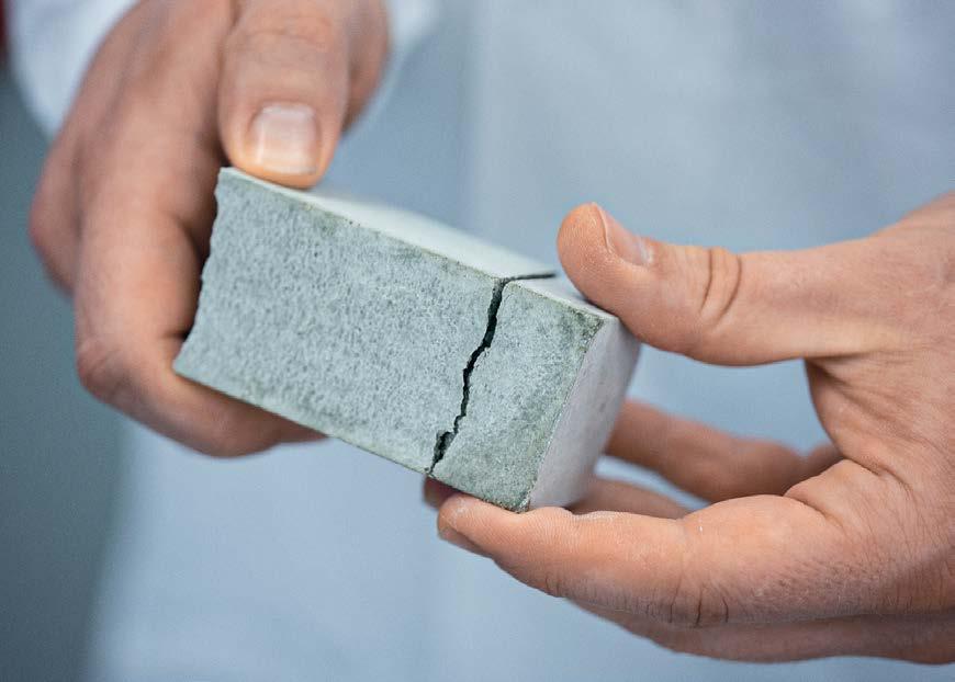 hen the chemist Dr. Anke Reinschmidt is explaining the special power of WallCraft, she asks visitors to stand very close to the concrete block that is dangling from a rope in the remotest corner of her laboratory in Essen. Only then can they see the thin white line that runs through the block. “Here you can see the place where the test piece was broken and has now bonded together again,” she explains. To demonstrate how firmly the crack has been mended, her team has suspended a pail of sand from the concrete block. The word “mended” is