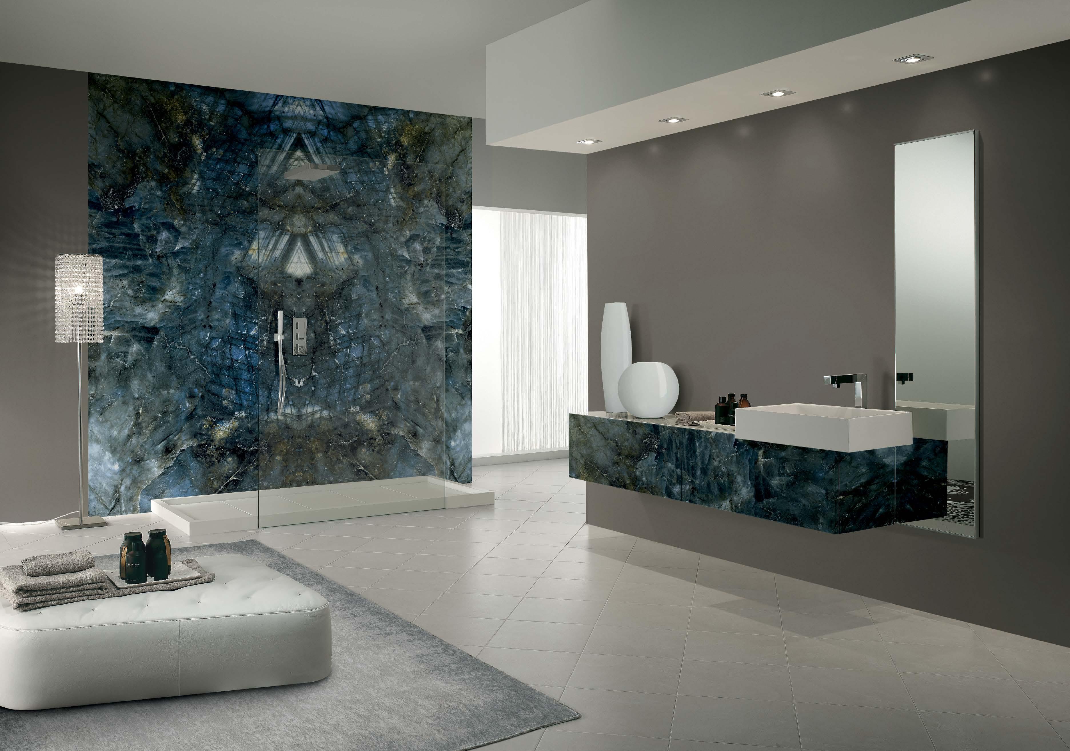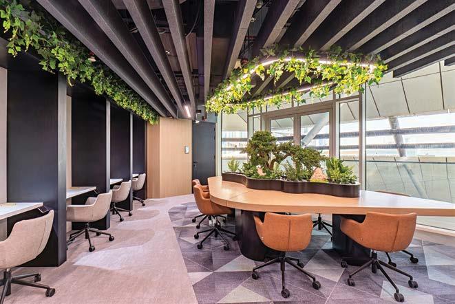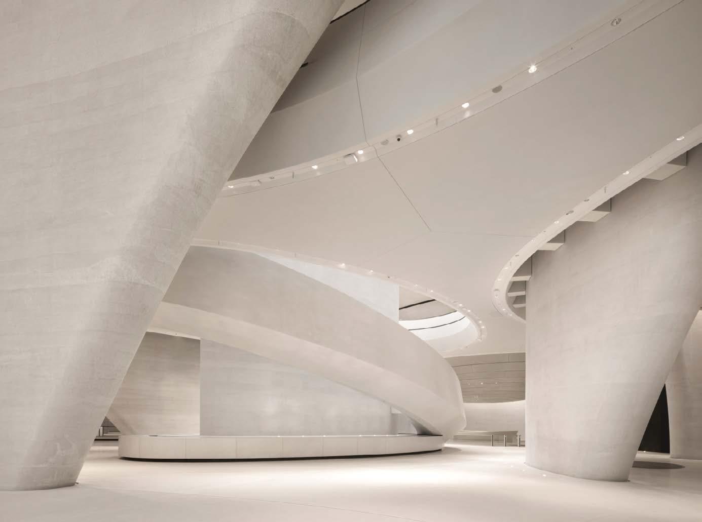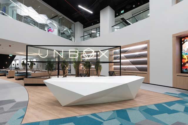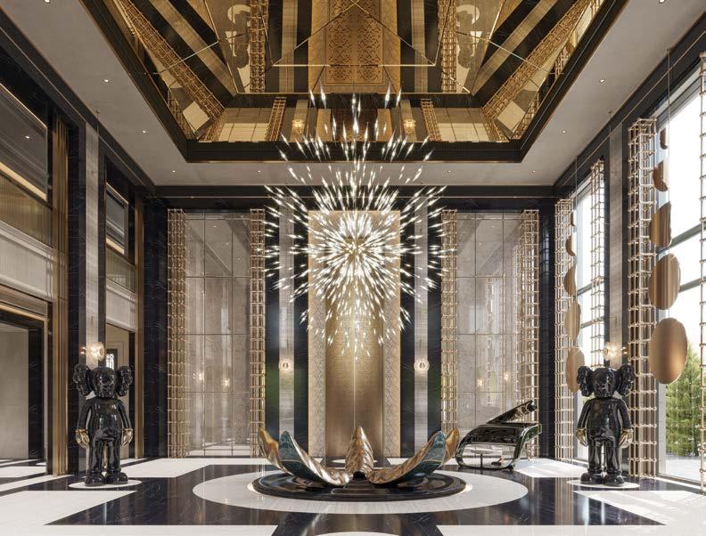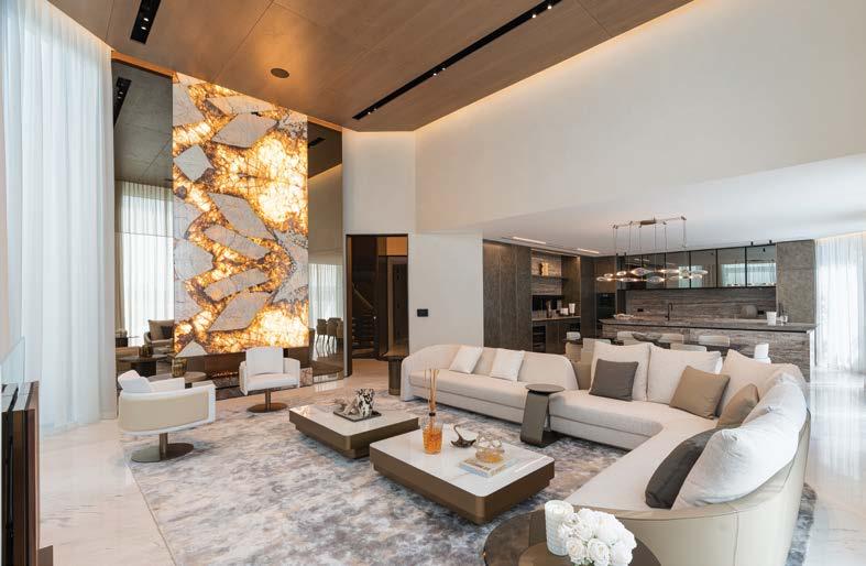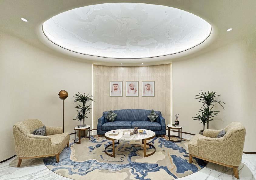 the ethos of Dubai and its leadership of unity, inclusivity, and tolerance. By integrating this installation into the workspace, the design transforms a simple gesture of language into a powerful reminder of shared purpose, reinforcing the office’s role as a space where perspectives converge. Materiality anchors the design narrative, with luxurious marbles such as Opal Blue, Fusion Wow, and Patagonia employed not as surface embellishments, but as architectural elements in their own right, shaping the space with depth, permanence, and quiet grandeur. Carved, engraved, and articulated through threedimensional geometries, these stones add depth and tactility while remaining intentionally understated. The dialogue between