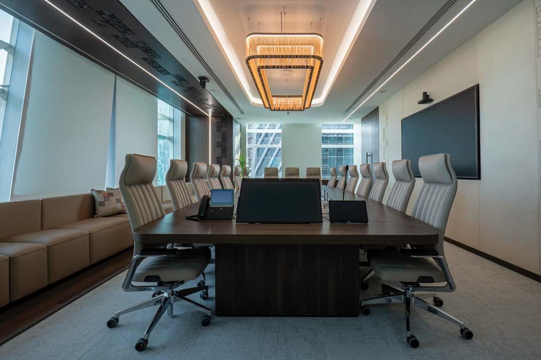 In the boardroom, a sculptural ceiling treatment inspired by sunburst formations radiates outward, cascading gently onto the walls and echoed in the hand-tufted carpet below.