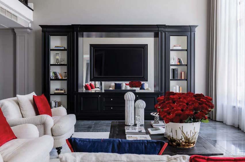 The mirror is bespoke, made by the designer sketches. It has comforting beige - like a puffy snow during the winter, dark brown details - like frozen trees and small touches of red decor to give the interior a little cherry on the top. The flooring is tiles from Kerrama Marazzi. Lamps from Ralph Lauren Home. Consoles are from Eicholtz. The rug is from Rug Company.