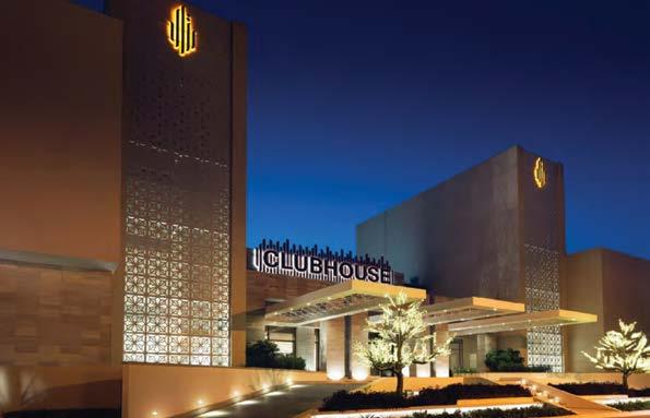 T'Kint completed the first phase in just over a year and a half, which was three times faster than expected. Upon entering the JW Marriott, guests are greeted by a beautiful triple-volume lobby with a glazed façade overlooking the elegantly landscaped outdoor water feature. The walls feature heritageinspired patterns that complement the building's modern façade. Backlit and highlighted by beautifully textured cladding, the seven-metre-wide reception desk is an imposing sculpture on marble flooring. A hand-blown glass Bomma pendant light installation depicting a clear desert night sparkles in the ceiling, illuminating the comfortable, organic-shaped seating below.
