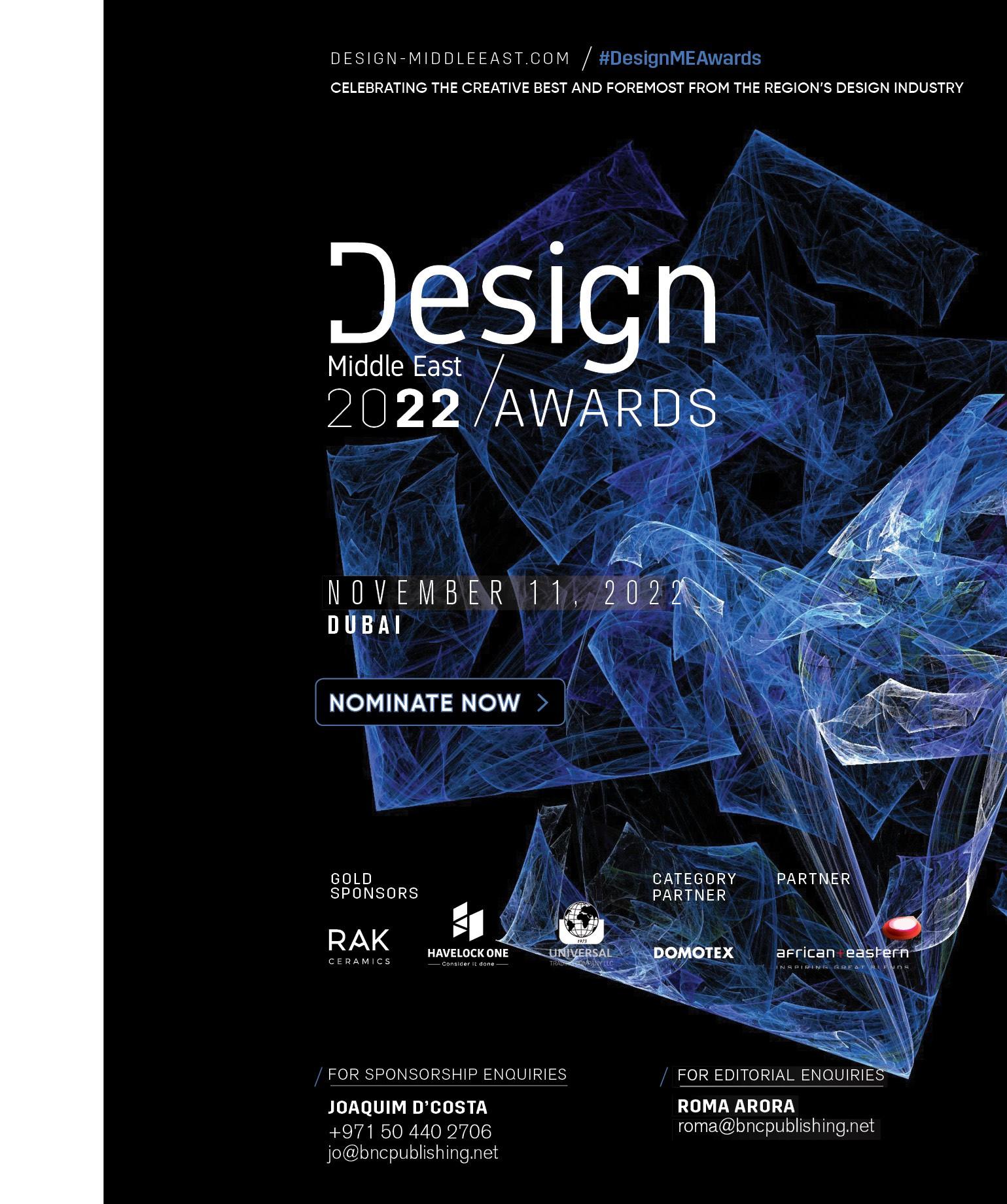 believe it's that time of year again, when we're neck deep in work, prepar ing for the design Middle East Awards 2022, which will be held on November 11, in Dubai. This year, we've added some new categories to engage a larger audience and reach out to different segments of the design industry. So, watch out!
