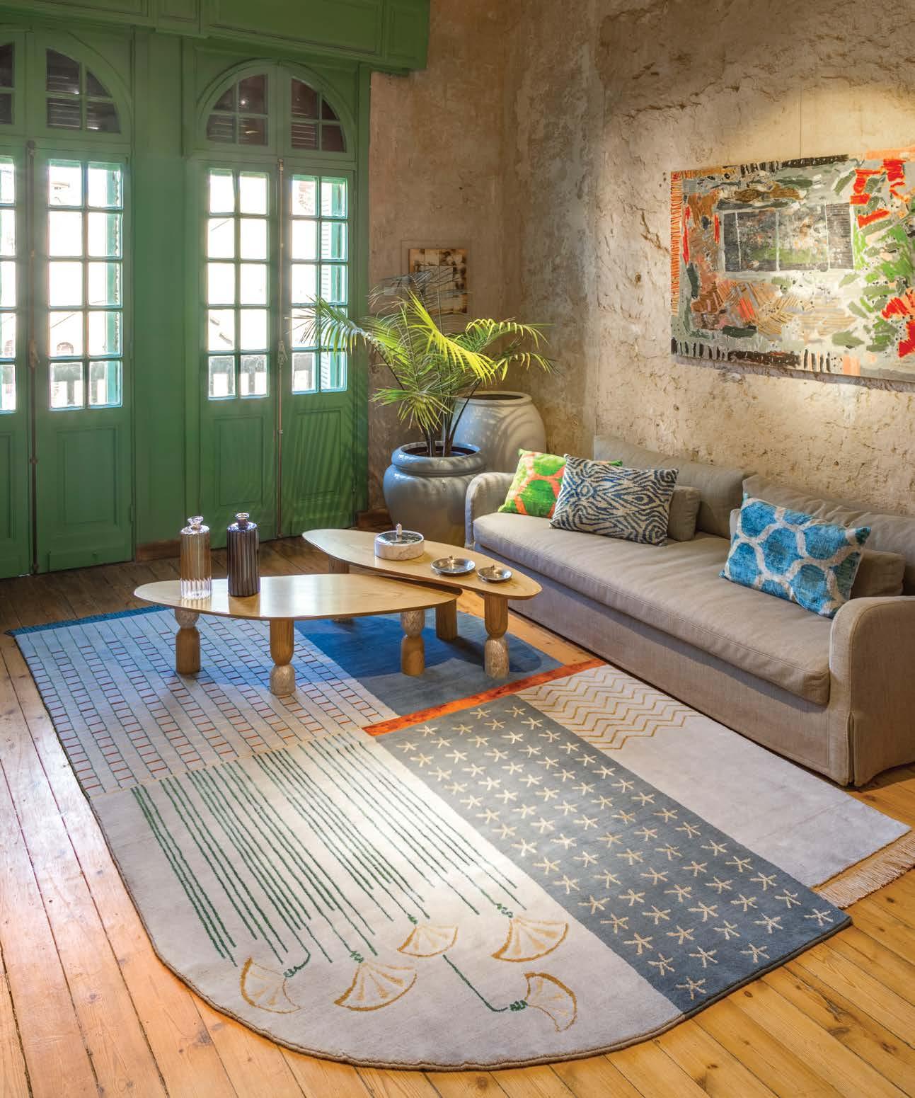 Shewekar's Pearly Ibis Collection, designed in collaboration with Kahhal Looms, features carpets with ancient Egyptian blossoms and motifs. kahhallooms.com