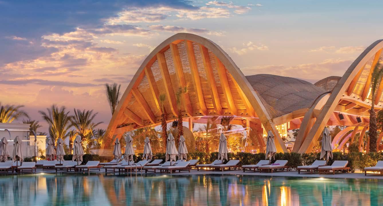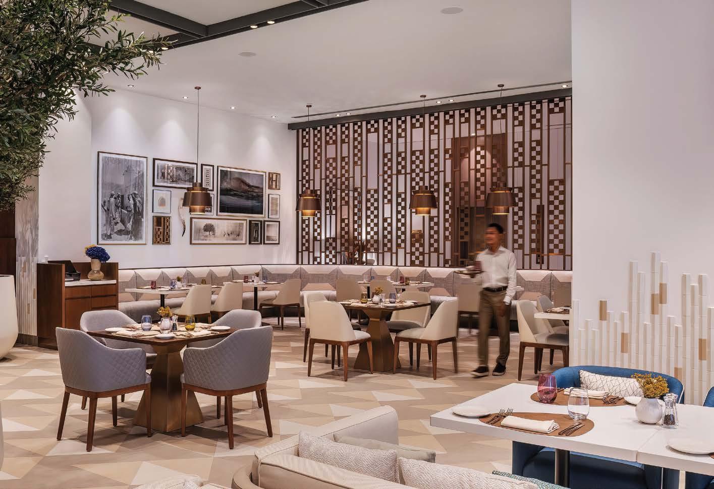 areas — brought together by a central hub — and welcomes guests to the halqa of Mina Seyahi, a mystical bazaar, in the style of traditional story circles or “Al Halqa.” Guests can enjoy a cocktail or a meal in the lobby bar and lounge while immersed in a fantasy world. Cheeky, playful, passionate, and hypnotic adventures create the ideal atmosphere for the space.