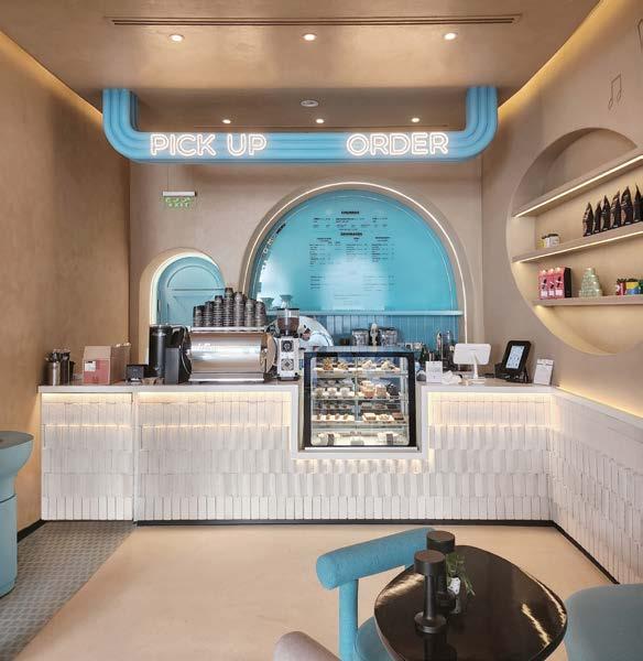 Engraved Cosmo brand icons adorn the walls, and the suspended ceiling organicshaped rope lights evoke the fluidity of an artist’s intriguing scribble or sketch. In the centre of the staircase void, 4SPACE has carefully placed a tree with branches extending to the first floor to add a touch of life to Cosmo Café.