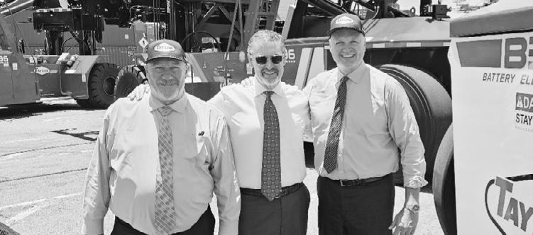 (L-R) are David Turner, vice president of Yusen Terminals; Robert Taylor, president and COO of Taylor Machine Works; and Alan McCorkle, president and CEO of Yusen Terminals, pictured with the ZLC 996 electric loaded container top handler lift trucks.