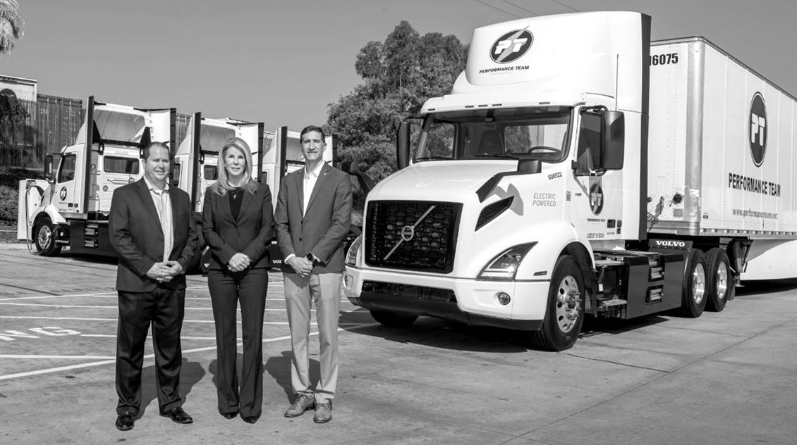(L-R): Michael Gallagher, head of indirect sourcing, North America, Performance Team; Tracey Craik, regional sales director, TEC Equipment; and Jared Ruiz, acting head of electromobility sales for North America, Volvo Trucks North America; with Performance Team’s Volvo VNR Electric fleet at their Santa Fe Springs facility.