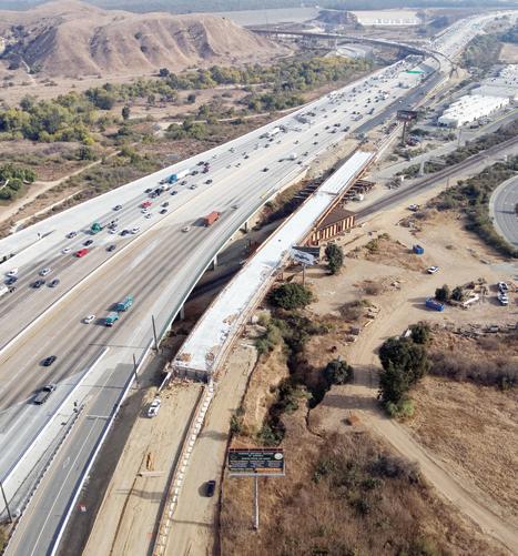 right-of-way [issues] near the Santa Ana River channel,” Tarascio said. “Another major challenge was spanning the SR 91 freeway, which has six general purpose lanes and two toll lanes in each direction. The falsework beams had to be spliced on site and spanned over 100 feet.”