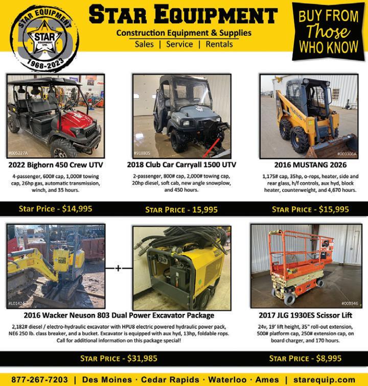Page 2 • April 15, 2023 • www.constructionequipmentguide.com • CONSTRUCTION EQUIPMENT GUIDE 2002 CAT 924G | $39,500 SN: 9SW02133 | Hours: 24,222 2013 CAT 924KFQ | $99,000 SN: PWR01499 | Hours: 9305 2019 CAT 906M | $103,000 SN: H6603626 | Hours: 584 2009 CAT D6TLGPDS | $127,000 SN: KJL00918 | Hours: 8,652 1995 CAT 615C | $49,000 SN: 9XG00477 | Hours: 2,015 2020 CAT 262D3 C3H2 | $40,000 SN: ZB202545 | Hours: 4,049 2019 KOMATSU PC210LC-11 | $128,000 SN: A12617 | Hours: 4,032 2017 CAT 308E2 | $101,000 SN: FJX09000 | Hours: 2,164 2015 CAT 323F HT | $225,000 SN: YEJ00246 | Hours: 2,705 36 LOCATIONS ACROSS MO, IL, WI & MI 636.384.4021