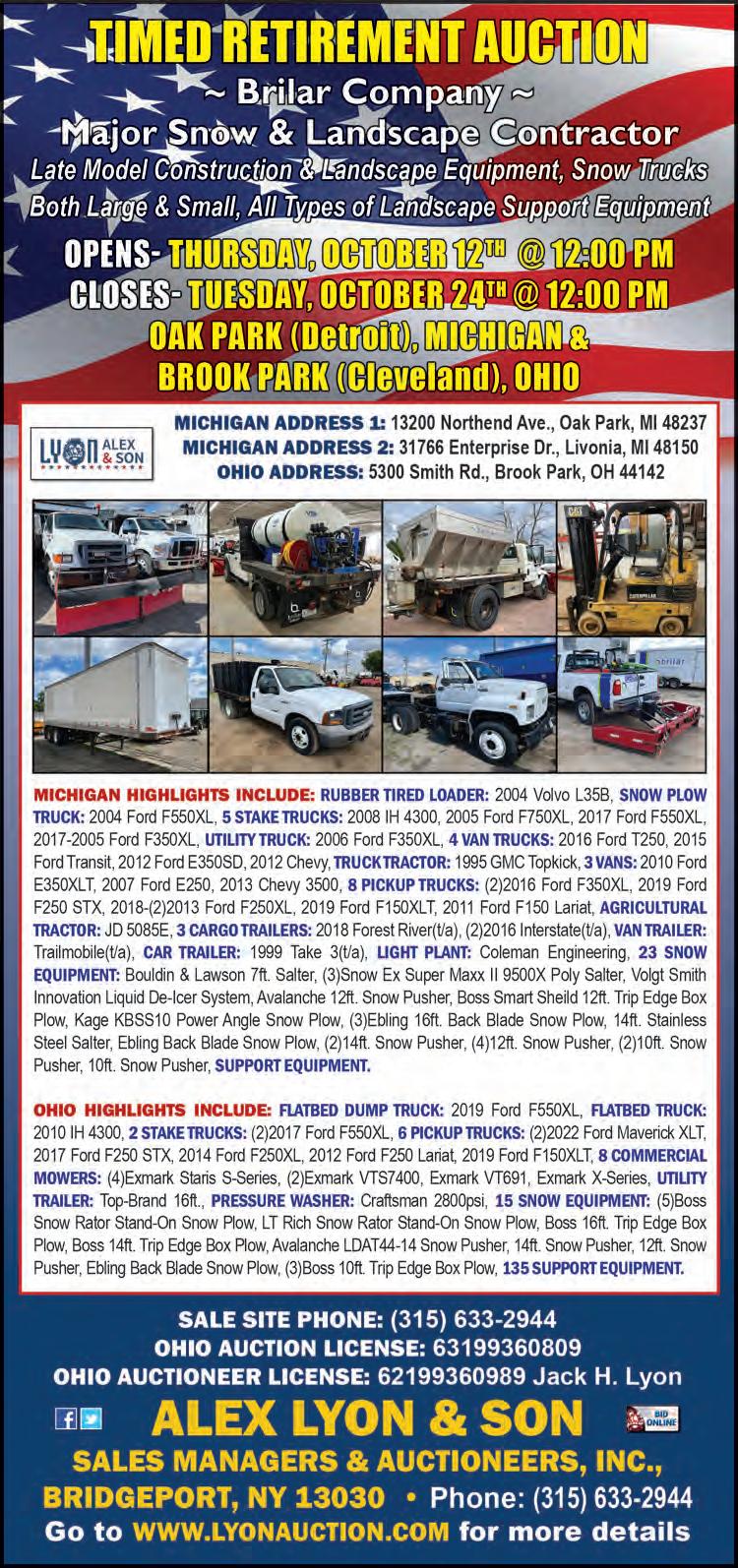 Page 104 • October 11, 2023 • www.constructionequipmentguide.com • CONSTRUCTION EQUIPMENT GUIDE PA Auction License No: AY000281 While information is believed to be accurate, all items will be sold “As-Is, Where-Is” without guarantee or warranty. A physical inspection is suggested. Call (800) BID-N-BUY or Email sales@hunyady.com For Complete Descriptive Brochure! www.Hunyady.com Crawler Pavers and Milling Machine: `17 VOLVO PF4410, s/n 378085, 8’ – 16’ w/heated bolt-on extns to 20’ (01,084 Hours) • `19 WEILER P385B, s/n 02701, 8’-16’ (1,532 Hours) • `05 WIRTGEN W1900 Crawler Milling Machine, s/n 092015031305.0241 (Meter Reads 5,529 Hours) Vibratory Tandem Rollers: `11 CAT CB434D, s/n CNH01225 (1,804 Hours) • `15 CAT CB34B, s/n 42300278 (2,983 Hours) • `08 CAT CB14, s/n DST00230 (869 Hours) • `98 DYNAPAC CC122, 12 Series, s/n 60113691 (4,307 Hours) • ROSCO Roll Pac III Tandem Static Roller • INGRAM 8 – 12 Ton Tandem Static Roller, s/n 39311466 Absolute Auction Live, Virtual Broadcast Complete Liquidation Estate of S.A. Macanga, Inc. Wednesday, November 1, 2023 – 9:00AM West Chester, Pennsylvania PLUS MANY MORE ITEMS TOO NUMEROUS TO LIST! Distributor Truck, Tack Sprayer, and Tar Buggy • Skid Steer Loaders and Attachments • 4x4 Extend-A-Hoes • Crawler Tractor and Crawler Loader • Compactor, Broom, and Motor Grader • Dump Trucks • Truck Tractor and Lowboy Trailer • Utility, Stake Body, and Pickup Trucks • Cab and Chassis and Water Truck • Tag-A-Long and Tilt Deck TagA-Long Trailers • Air Compressors • Water Trailer • Forklift • Contractor and Shop Tools, Survey Equipment, and Miscellaneous