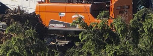 This was backed up by several Volvo 480 excavators with grapples and shears to process the downed materials. Debris loaded with two Volvo 180E loaders equipped with solid rubber tires for demolition work. Also on site were several Caterpillar 236 skid steers with solid tires and demolition grapple buckets.