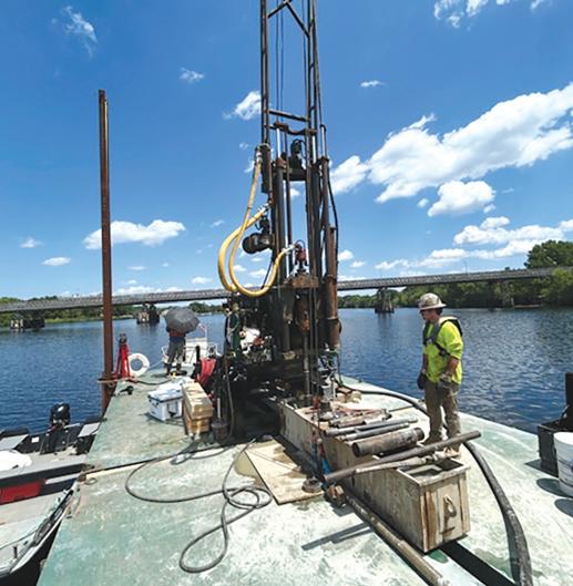 Investigative in-water soil borings were conducted during June, July and August using a barge-mounted drill rig, alongside on-street borings on Wood Street, Middlesex Street, Pawtucket Boulevard and Old Ferry Road. This work provided data on soil strength and composition to inform the final design.