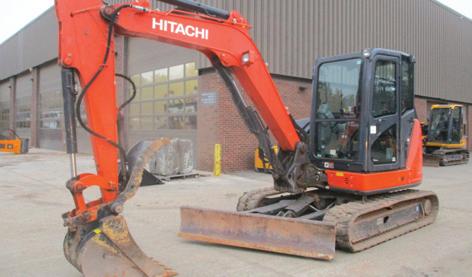 • A Wacker Neuson ET65 compact excavator with twopiece boom, configured with additional hydraulic capability to power a rotating attachment (described as a third-circuit setup for rotation).