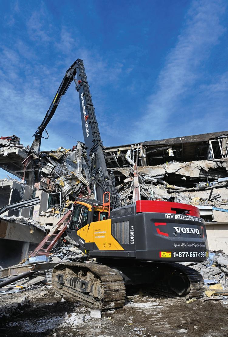 In practical terms, that meant one operator could cut, grab and drop overhead systems more efficiently than a lift-andsaw plan — reducing labor exposure at height while accelerating production. The team framed it as a double win: fewer people in harm’s way and fewer “touches” on material (cut it, drop it, handle it once — instead of cut it, drop it, rerig it, re-handle it). Once the mechanicals were down, Able Tool exchanged the steel cutters for concrete crushers and Associated Building Wreckers was quickly back to work at the site, demolishing the large elevator shaft. It was quick and clean work, especially considering the contractor did it all with a 6-ton mini-excavator.
