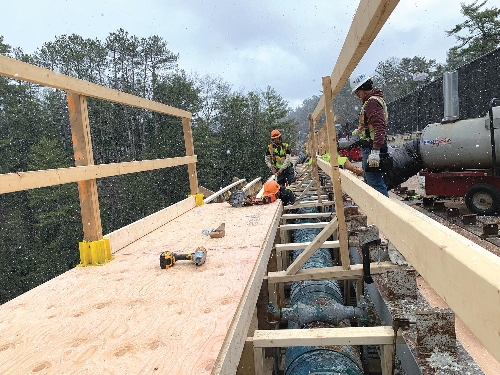 Deck and sidewalk construction also has been complex, requiring suspended formwork systems built by carpenters across nine 20-ft. bays. These systems must support wet concrete and later be dismantled efficiently after curing.