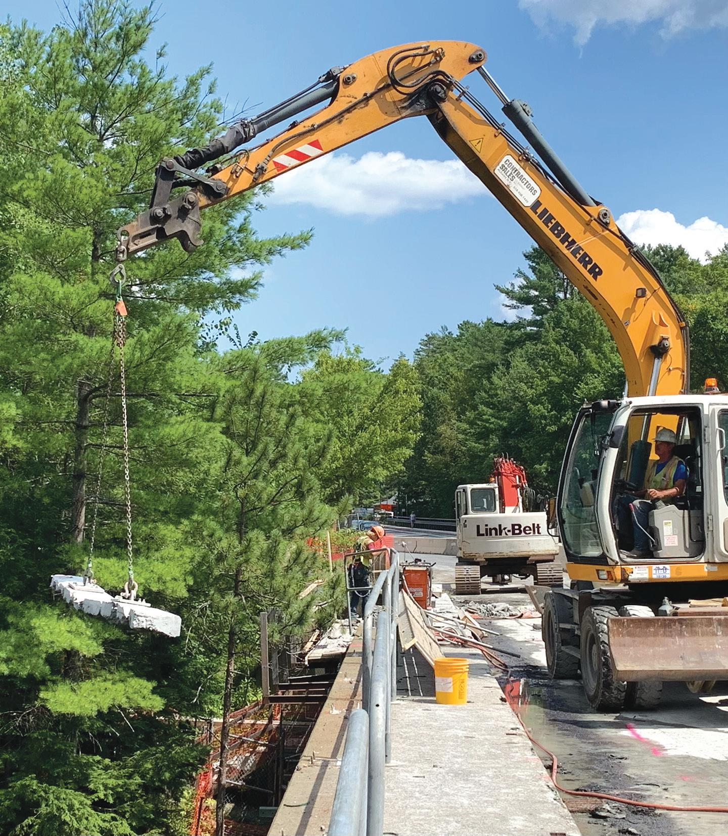 “We used a Link-Belt 135 excavator because its compact dimensions allowed it to operate on the deck while still providing the necessary lifting capacity,” Merwin said. “For tighter conditions, such as maintaining access for snowplows, we used a smaller KOBELCO 55 excavator. We also implemented protective measures around a waterline running along the north side of the bridge.”