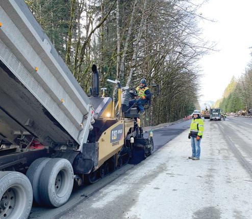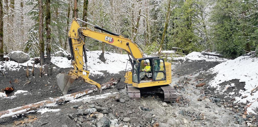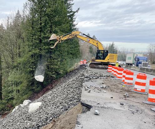 The road was completely closed for a week in midDecember after the Sauk River overflowed, washing out a 300-ft. section of the route’s embankment and a section of the westbound lane. Crews are building a temporary gravel bypass road on the east shoulder of the roadway to allow limited traffic through the work area while they construct a new embankment, rebuild the roadbed with gravel and then pave and stripe the road.