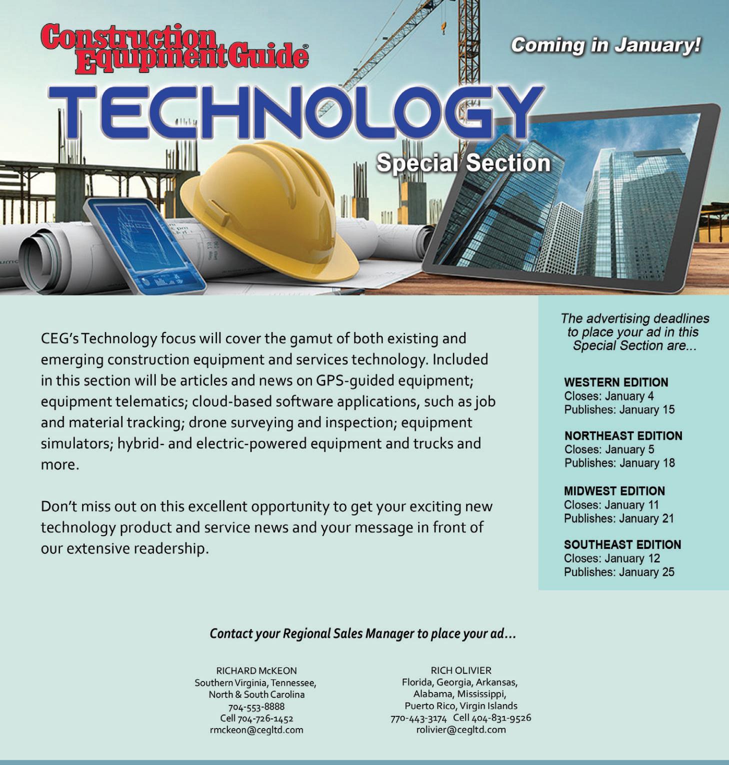 schedule and media kit. The Construction Equipment Guide is not responsible for clerical or printer's errors, every care is taken to avoid mistakes. Photographs of equipment used in advertisements are not necessarily actual photographs of the specific machine. Similar photographs are used occasionally and every effort is taken to depict the actual equipment advertised. The right is reserved to reject any advertising. SOUTHEAST EDITION Richard C. McKeon • North & South Carolina • Tennessee • Virginia 704/553-8888 Cell 704/726-1452 e-mail rmckeon@cegltd.com Kent Hogeboom National Sales Manager 315/866-1423 Cell 518/221-5159 e-mail khogeboom@cegltd.com Rich Olivier • Alabama • Arkansas • Georgia • Mississippi • Tennessee • Florida 770/443-3174 Cell 404/831-9526 e-mail rolivier@cegltd.com Founder Emeritus (1930-2021) Edwin M. McKeon Sr. Southeast Publisher Richard C. McKeon Executive Publisher Teddy McKeon Editor In Chief Craig Mongeau Senior Editor Robby Chakler Editorial Assistant Katherine Petrik Contributing Editor Eric Olson Production Mgr. John Pinkerton Controller Judith Nixon Circulation Mgr. Cathy Printz Main office 470 Maryland Drive Fort Washington, PA 19034 215/885-2900 Toll Free 800/523-2200 Fax 215/885-2910 Web site www.constructionequipmentguide.com Advertising e-mail production@cegltd.com MobileLinkedInFacebookTwitterYouTube To read these stories and many more, visit www.constructionequipmentguide.com IN THIS ISSUE For advertising rates Contact