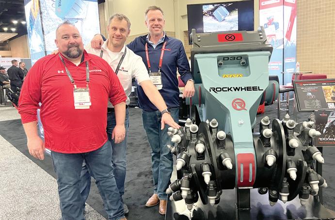 The Shearcore-Connect Work Tools-Rock Zone Americas group of companies had a large presence at the show. (L-R): Joe Mero, Robert Piasecki and Geordie Stewart answer questions about the RockWheel hydraulic rotary cutting attachment.