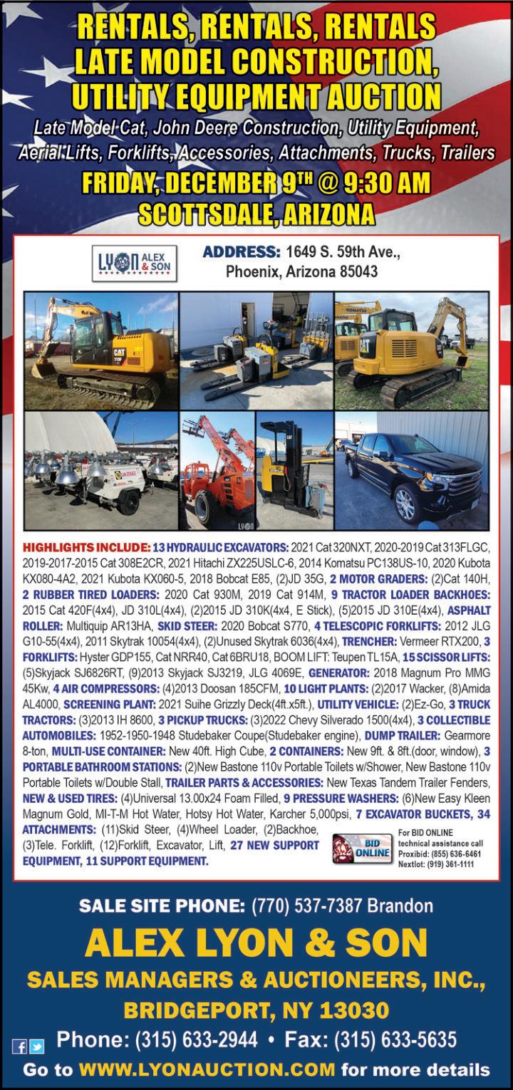 Page 2 • December 4, 2022 • www.constructionequipmentguide.com • CONSTRUCTION EQUIPMENT GUIDE AD CEG-08/22Photo credits: SémaphoreNo binding document Southern Idaho - Colorado - Northern California - Utah - Arizona 303-502-5525 www.globalmachinery.com Southern California 800-316-0327 www.scottequip.com Western Washington State 800-292-4441 www.jetcityequipment.com WWW.MECALAC.COM MAKEYOUR MOVETO MECALAC ANDA WHOLE LOTMORE! YUP IT’SAN EXCAVATOR… Here's how the BARGAIN ADS Work: • Supply us with a photo of a machine (one machine per Bargain Ad) and a maximum 17 word description, plus contact and phone number. • Either email your copy & photo to: production@cegltd.com, or mail to: Construction Equipment Guide, 470 Maryland Drive, Ft Washington, PA 19034. • Cost is $135 per ad, $60 additional for color. • Your ad will run for two consecutive issues in 1 region. Your Ad Will Be Seen By Over 23,010 Construction Equipment Buyers in the Western States. For more information, call Construction Equipment Guide today at 800/523-2200 The Easy Way To Advertise Your Equipment Run In Two Consecutive Issues – Black & White $135 • Color $195 Sentry Tires - Skid Steer and Wheel Loader Tires at Volume Buyers Prices! Call Company Wrench for Sizes & Pricing Call 866-294-6103 25-26 EB SPECIAL APPLICATION BUCKETS FOR ALL EXTREME APPLICATIONS Hundreds in Stock - For all excavator models. attintl@loretel.net or call us & 218-863-6444 www.attachmentsintl.com 25-26 AP 24-25 TM