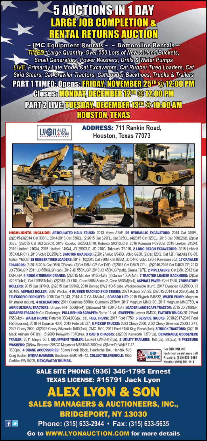 563-8 sales@jj Bellevue (D 872-441112 jscheckel.com ubuque), Iowa Multi shank ripper arr li omponen T D10T - $688 Ud 2006 CAAT Low c Mlihk thours.95%+Underc i r, , Documented hist dealer maintenance contract, Reputati arriage g ll , 24” T D7E - $ S lh 2018 CAAT T A03113. 5,040 otalhours, Excellent Underc F ” Pad Control ready, Full service his y riage 8,000 U g U , U Blade, ory, , Under ion machine $178,000 , ld/ tr eeps ipper pp d G T D6T X 2018 CAAT H A03116. 4,437 Hours, 1,3 Rear MS R r, , Sw p l , ARO GPS Grade Con o ol re UB U Blade w/ tilt, s, ARO GPS Grade tory since new. machine w/ pr p d ll nly 2,102 DEF 2014 CAAT T D6T A03081. O y / / e-DEF e w/ exce ent undercarri arriage XW - $328,000 , SUbld l 74 in neutral.SUblade Good underc ii , ady. Clean & original lean and original g /B R riginal hours Cl O $318,000 ,h l VPA XW PAAT TR g .Rarelowhour emmisions. SRd age. ARO GPS Ready Rent/Buy. 2011 CAAT T D A03063. 5,055 hours. 100% N Accugrade GPS ack chains and spr Ready d p dhi D ing T - $288,000 ,k $ l A D6T XW VPAT A 5 Total hours, 3,125 Actualwork ARO ew trockets. y, , ocumented history. Clean. eputa p hi . High r i tual oper Y 11’10” $388 T (2)2015 CA lh ) 10000 AT T 374FL’s10,000 Tootal hours, 8,500 ac h a ” Stick, 6 Yaard Bucket g d t machines with documentedservicehisto , 50” , 12’8” $ 2019 CAAT T 349FLk A03110. 5,170 Total hours, Quick hydraulics ” Stick ” Bu undercarriage, Very clean ting hours 8,000 Ea. , ih g tion,i1 1 owner ry since new. y 2019 CAAT T 336 Nex 3,700 Total hours, 1,486 hydraulics, 2D Grade contro Documented history, , V oupler p Lik $338,000 k ,l A c r, , uxiliary ucket, Like new machine. y , 54” . 10’6” $268,000 , ili xt GenA Idle hours, uxiliar l ” Stick ” Bucket, ery clean machine. ariable adjustable b P j i O or 2018 CAAT T M Wheeled excavat r, , 47 V k bucket, utriggers, u y boom, 8’6” S , 60””yH hbld $208,000 d ,h A M318F75 total hours, ux raulics, ” Stick ” H d tilt shblade, uper clean machine ggrega 2018 CA Agg 13 g 03A te han 1,303 Actual 875 Radials, Ne yload monit hi i ing hours db or $498,000 dler AT T 980Mh r, , 1,747 Total hours, 444 at idle, work g 5 . Pay S r, , ew 7.5 yardbucket, Servicehistory. ing hrs D Y ega g 3 ggr $348 h e Handler 2016 CAAT T 980M A g idl l t r, , 6,120 Total frame hr idle. 3,851 Actual work g k . Payloa 875 Radials, 7.5 Yaard bucket, ocumen , 6.25 y y ing hours L s (3)2017 CA lf AT T 972M’ ~9,000 total frame hours, 5,000 Actual work g hi y ili Documented history, , Low utili ad monitor 8,000 , rs, 2,269 hrs at dhi r, , nted history. Y 2020 Deere 744 ddf 2,930 Hours, Extended fac or 6,000 hours, 5.5 Yaard G Excellent condition $228,000 Ea. , dl h 0 ours at idle, 4,000 ard GP buckets, ization machines. y till 2026 l y w 4L - $318,000 , ll tory k arranty P bucket, Ride contro , , Original paint. e y (2)2018 CA ) h5000 ( L AT T 7 Less than 5,000 hour pair available. N warranty, , Michelin w tailga ching s - $488,000 Ea. h , dl 45’ rs w/ 1,500 at idle. Mat g 875/65/ tes. Transmission 875/65/29 extra wide tires. y a ang g (3)2018 C () 7,300300hhour r T since new. warranty, , ilga g l ogether ching set of 3 tr , 90% Rubber T ge $388,000 Ea. h , k CAAT T 745’sf il , Mat g 90%Rbb ucks, t g ii C tes r, , ransmission Clean trucks with full history. y to ship! Read utting width. Ma c or 16’ ’ 2 Models / 0 , - F11Holmes , 11’ $29,50 HOLMES SMOOTH DRUM ROLL ed y clea riginal pain $548 ilb 2014 CAAT T 825H l 6,350 Hours, Multi-month rental availab feet, O p t, Tilt blade, Very 1 ownermachine. For rentorsa 2412DE Scraper Pkg ADES 2017 John Deere 9520 a. ade in I $36,500 LERBL NE NEWEW! W! ixing or M T RM500BlR Ui 2019 CAAT 1,180 Total hours, Universal Ro Reclamation, Soil M i CAT dealer maintained since new n, Ex 8,000 E ,bl ble, Excellent l cellent ale - $488,000 RX & Deere ec 1233 Scrape Te 2016 John Dee K-T ing hours sinc iS T RM40 2020 CA iningg’. 540 HP sphalt - $588,000 or f , hl A ot foor p 40HP M W P. on’t disappoint! AT h 240 Total frame hours, 106 work g Rl e new Asphalt Reclamation, Soil M ec 1228 Scr K--TTe K T 1228S2017 Case IH S er Pkg- $468,000 re 9570RX & as clean as they c y h W Moldboar 16’ 2008 CA . 415 HP 00 - $658,000 , 134A 6Idlh 6 Idle hours, 134 Actual . Universal Rotor for ixing or Mining P. AT T 16 d, Ripp ilbl om available atch ma $ raper Pkg- g SteigerPk580 Quadtrac $598000 T 2015 Case - 122 K & K--TTeec epor esting rull pr per VHP - $328,000 , Mhi F E 6M N r, , Non- missions, Machine e. essure t id p li t chine operating video online e good h age of 7 S d (7)CA k ) P AT T 631G Pac g These ar g h that IH Steiger 620 Quadtrac Quadac 28SPkgQ$518000 28 Scraper Pkg- $518,000 eputa , clean, high r g ll b apers a S s - $348,000-$588,000 , l G’ , ilblf cr p lh vailable for rent or sale p i tion machines ave been well maintained t prior ting & sealing dir ompac , c elinglev di g T W AT or ha F y eme dut eadetrx,tion r uconstrC g d h WE OWN WHA visit on ed & inspe maintained.Dealertest , , , d p ent ain ev o r t trem , Ex r, Yaardscr 24 4,475475HHrs Y d E aper com pg e oad & sit WE ADVERTISE! 56 all: aul r c JJScheckel. ory ed w/ full hist tec yd/fllhi ted.1 ed & inspec Dealertest , , , ell mely clean and w g$, lld 33 acks t tr cellenEx 4,800 Hrs H ll p k vide sales@ |email: 63-872-4112 for detailed photos, ewreartra , N , warrant ,Q y ownerwellmaintained id , ll p y uad 2,634 Hrs on the Q y clean. Ver r, Yaardscr 3 Y d aper l and descriptions! jjs www g$, @jjscheckelcom | eos, ard . 2022 28 y cks 28 , y emely c e Ex dtrac E g l pg quipm Large E oaders heel LWtion, t 740/745, & aleetCuckFrT t 374FL aorsCtavacgeExarL , T, T, aersCzogeDarL with & will not be bea Delivered Nationwide t D8T, D9T w orfo scheckelcom | tr The fastest gro wusf aper clean, F $, lF dEj actory Eject scr r. aper 4,222 Hrs on Quad Eject scr r..Extr ment Rental .e, and much moraperscr,Ss o A40GolvV L, 390FL , D11T T, at on price and terms! e are easy to workW. D10T wing choice for 