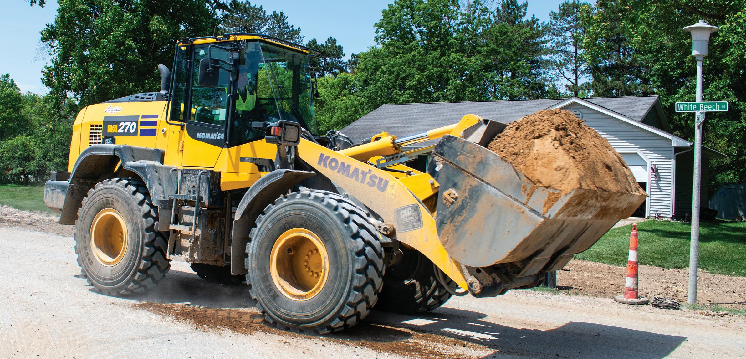 An American Excavating operator moves dirt with a Komatsu WA270-8 wheel loader on a utility project in Saginaw, Mich.