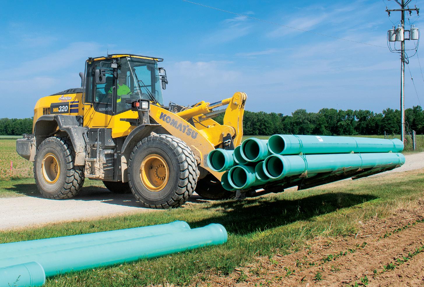 An American Excavating operator strings pipe with a Komatsu WA320-8 wheel loader on a project in Caseville, Mich.