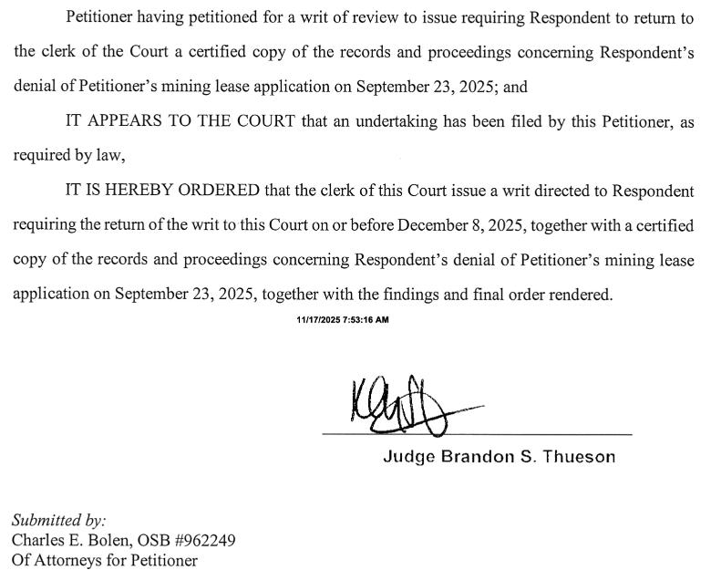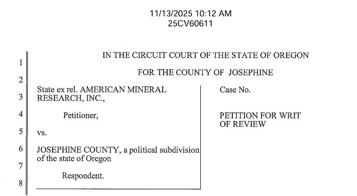 American Mineral Research, Inc. (AMR) has escalated its legal battle with Josephine County, filing a formal Petition for Writ of Review in circuit court seeking to overturn the Board of County Commissioners’ 2–1 decision to deny a mining lease application that the company says could have generated up to $20 million in royalty revenue to Josephine County law enforcement programs over the life of the project.