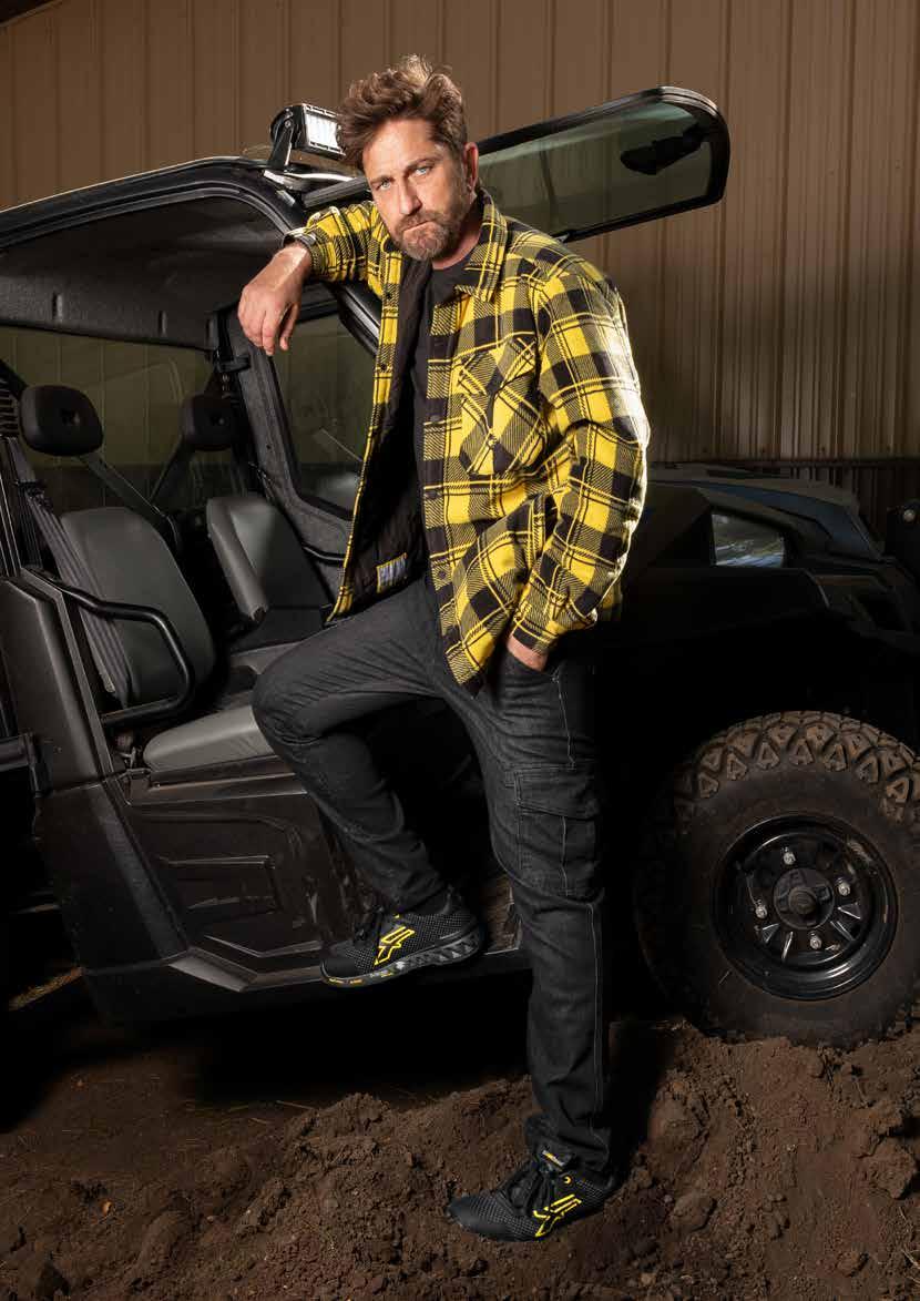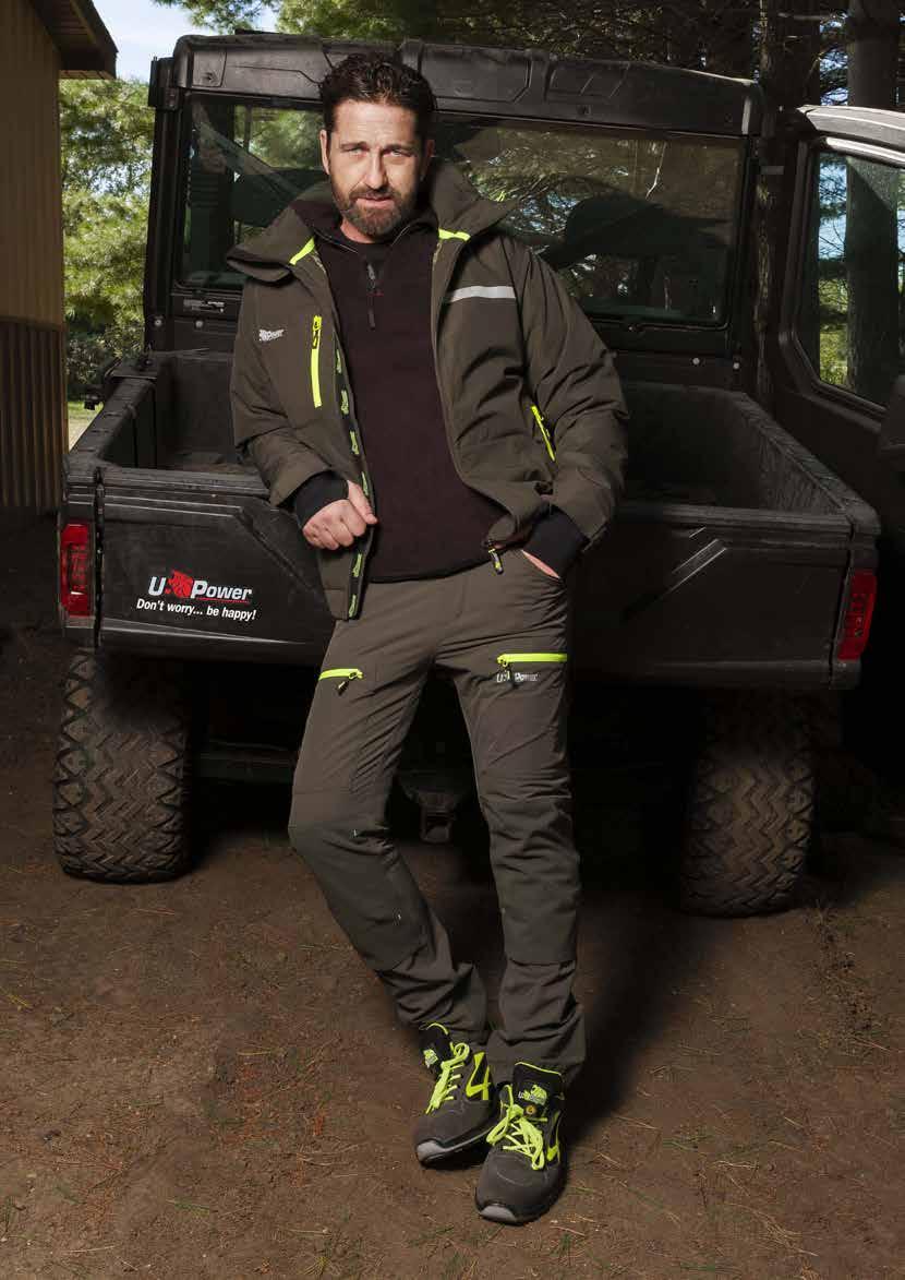 En la foto GERARD BUTLER chaqueta de softshell SPOCK en la variante de color Grey Meteorite, pantalón ATOM en la variante de color Asphalt Grey, zapatos LOGAN de la línea Red Leve, guante U-POWER FLEX.