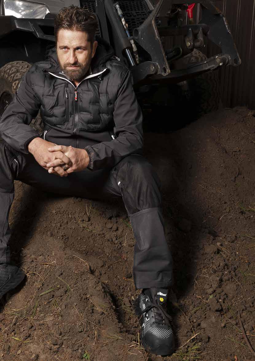 Sur la photo: GERARD BUTLER veste softshell SPOCK dans la variante de couleur Grey Meteorite; pantalon ATOM dans la variante de couleur Asphalt Grey; chaussures LOGAN de la gamme Red Leve; gant U-POWER FLEX.