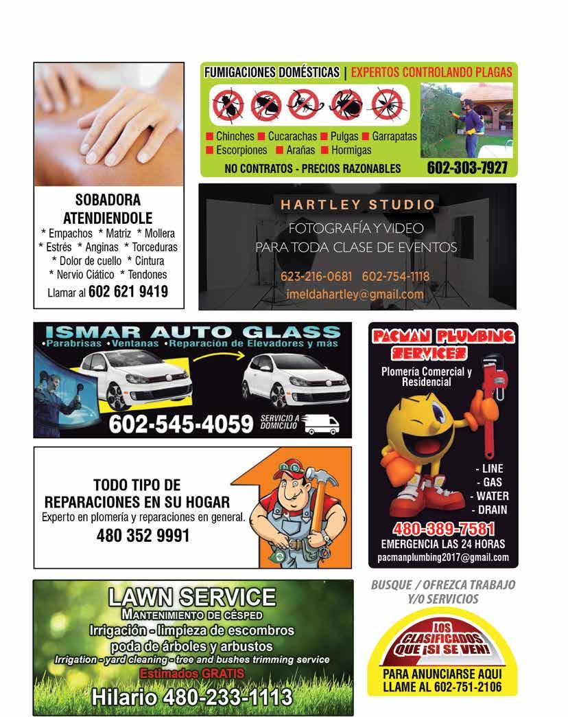 CONTACTO TOTAL LA REVISTA QUE HABLA N° 175 | OCTUBRE 5 A 18 DE 2023 43 A Chambear Palafox carpet cleaning ¡Ya es hora de limpiar su alfombra! Servicio profesional de limpieza de alfombras, limpieza de sillones, detallado de interiores de autos. Presupuestos gratis. 480-580-1406