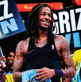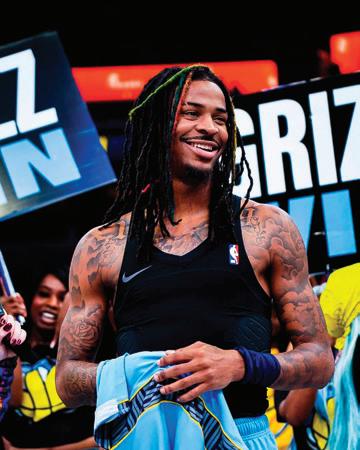 Morant did not need a long runway. He was a revelation almost immediately. e speed, the vertical pop, the audacity. He played like someone who had never been told where his ceiling was. Memphis embraced that fearlessness because it mirrored the city itself. Undervalued. Overlooked. Unwilling to ask permission. FedExForum nights became events. Not games, events. A random Tuesday could turn into a shared memory because Morant decided to attack the rim like it owed him money. For a small market that has always had to ght for relevance, that kind of star matters. He validates. He tells the city that greatness does not have to come from somewhere else.