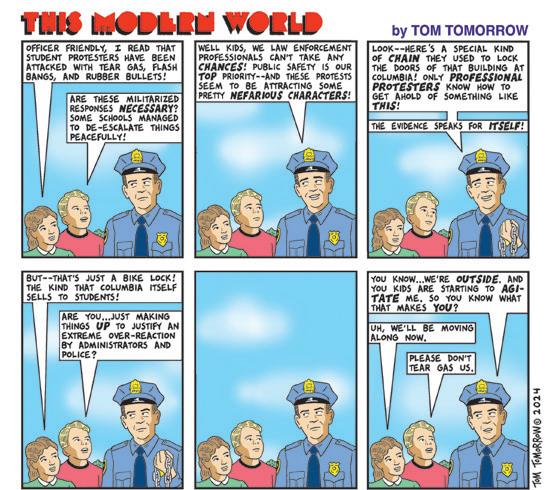 I’m not singling out the Times story quoted above as uniquely problematic in its coverage of the latest turn of events in the Middle East, but rather as representative of the accepted insanity of endless war — the reduction of war to an abstraction, virtually always involving clearly de ned good guys and bad guys, and describing murder (including mass murder) as retaliation, selfdefense, “show of force,” etc., etc. “National interests” are the prize at stake. Human lives are just bargaining chips, except, of course, when the bad guys kill them. e Times story, for instance, steps beyond its abstraction of the Israel-Iran confrontation at one point. Israel bombed Iran’s consulate in Damascus, Syria, killing several Iranian o cers, the story informs us. Iran retaliated two weeks later, ring 300 drones and missiles at Israel, almost all of which were shot down, and very little damage was caused. e Times notes: “ e only serious casualty was a 7-year-old girl, Amina al-Hasoni, who was badly wounded.”