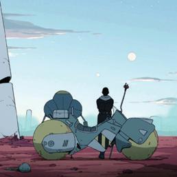 Scavengers Reign begins with its castaways, survivors from the crew of the cargo ship Demeter 227, already stranded on the planet Vesta. Azi (voiced by Wunmi Mosaku), the capable quartermaster, is paired with her robot Levi (Alia Shawkat). eir escape pod landed safely on open ground, and Azi uses an omniwheel motorcycle to scout the surrounding terrain. When Levi starts acting odd, Azi discovers that a fungus-like alien life-form has been growing on the robot’s circuitry — and the robot likes it.