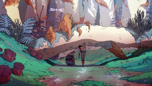 In writing class, they teach about the di erent kinds of con icts a story can center around. Person vs. person is the most common, but there’s also person vs. self, person vs. fate, and person vs. society. Person vs. nature (formerly known as “man vs. nature”) is not nearly as common as it was a hundred years ago, back in the days of frontier and jungle adventure magazines. at’s one of the reasons the sci- animated series Scavengers Reign is so refreshing. Its take on the classic story of a shipwrecked crew struggling to survive in a hostile wilderness is simple at rst, but becomes more fascinating as complexities emerge. In fact, “emerging complexity” is one of the overarching themes of the 12-episode story. Creators Joseph Bennett and Charles Huettner are fascinated with the interplay of life-forms, both cooperation and con ict, which create a functioning ecosystem. e world they have created is unlike anything you’ve seen.