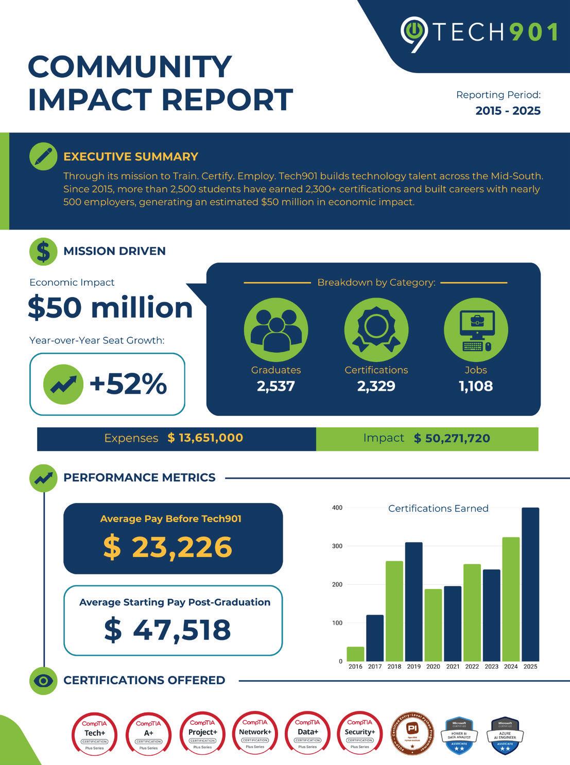 Ten years in, Tech901 estimates it has generated approximately $50 million in economic impact across the Memphis region — compared with roughly $12 million in total program costs. That impact continues to compound as graduates earn promotions, transition into higher-paying roles, and build long-term careers in technology. What began as a response to a local hiring gap has become a workforce engine designed to grow Memphis talent from within. A decade after its founding, Tech901 is no longer proving a concept. It is scaling a proven model.