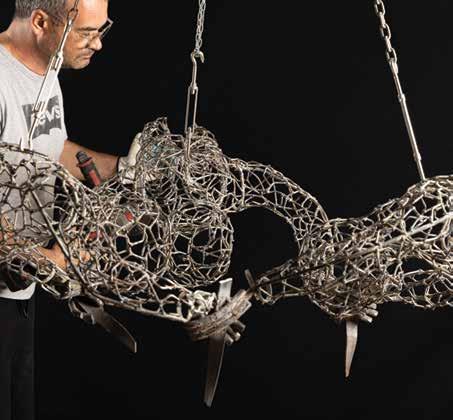 As we continue our chat, he highlights another sculpture, Home is Where the Anchor Drops, explaining that the main material used in this piece is a complete salvaged chain and anchor from the sea. It also features a net, crafted out of welded construction nails.