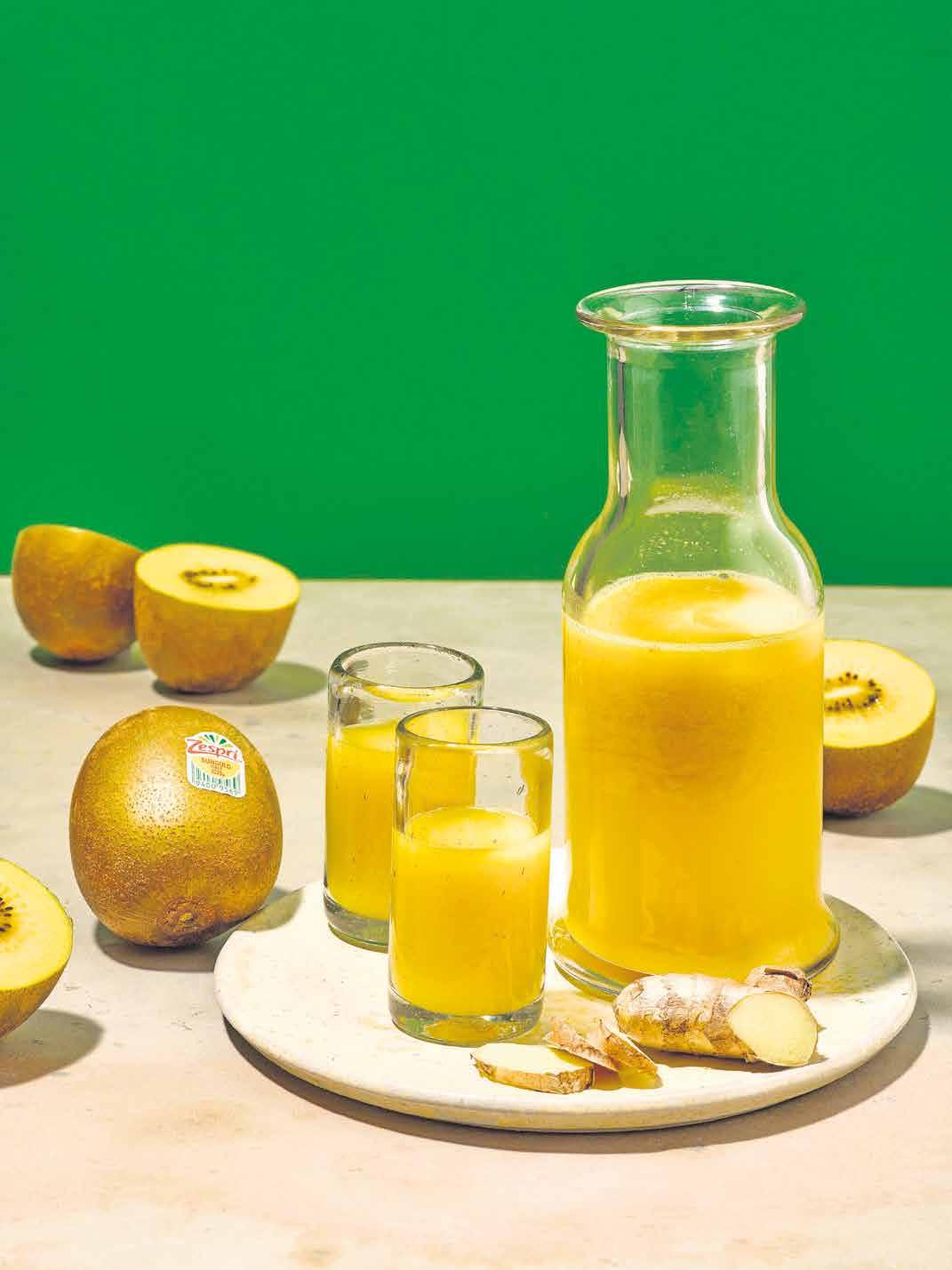 Eine einfache Möglichkeit mehr Nährsto e in die tägliche Ernährung zu integrieren ist dieser SunGold™ Kiwi Ingwer-Shot. Schnell zusammengemixt, hält er sich über mehrere Tage im Kühlschrank frisch und kann so täglich dein Immunsystem unterstützen. Mehr Kiwi-Inspirationen: www.zespri.com