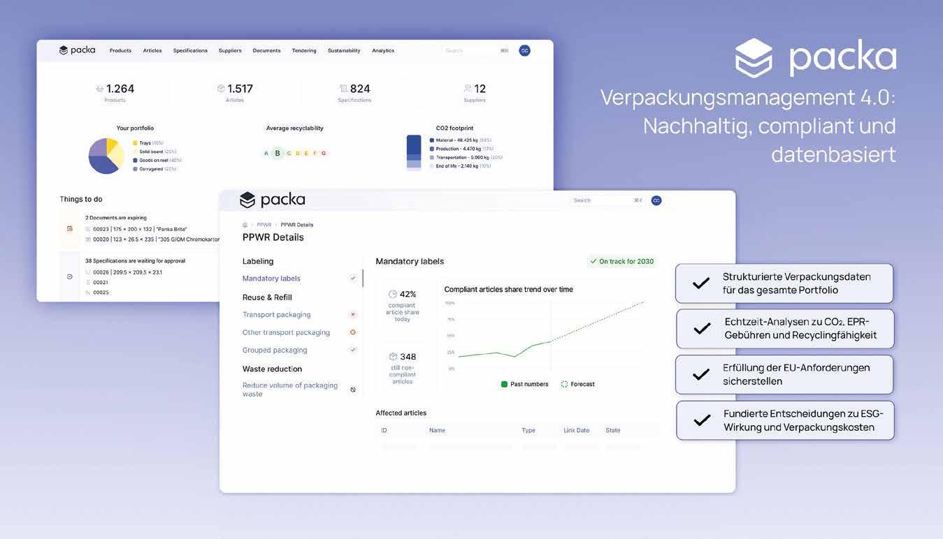 zu höheren Kosten als nachhaltige Verpackungen.Die Packa-Software ist eine lohnende Investition, denn August 2026 ist erst der Anfang. Über mehreren Etappen werden die PPWR-Anforderungen bis ins Jahr 2040 verschärft. Spätestens jetzt sollte jedem klar sein: PPWR ist eine strategische Aufgabe – und zwar eine, die Einkauf, Qualitätssicherung, Geschäftsführung und Nachhaltigkeit gleichermaßen betrifft.