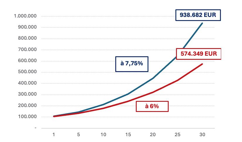 100.000 EUR belegd à 7,75% of 6% gedurende 30 jaar