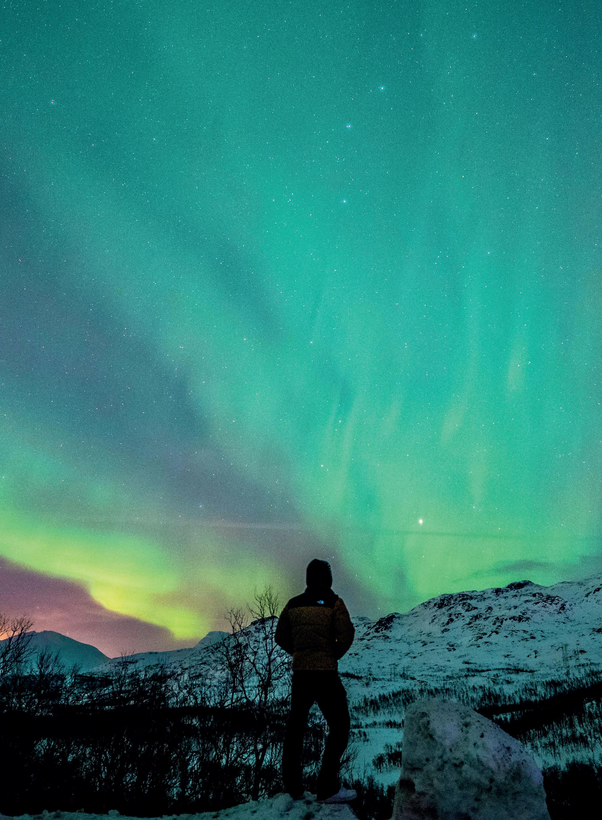 4. Nordlysjagt i nord I Nordnorge er vinteren højsæson for at opleve det magiske nordlys – enten med snesko, hundeslæde eller fra et glasdækket udsigtspunkt med en varm drik i hånden.