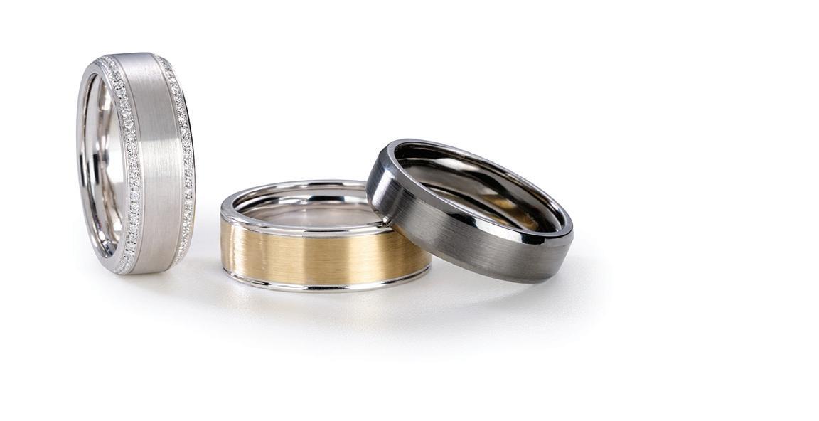 We offer a diverse selection of men’s wedding bands, from timeless classics to bold, distinctive designs.