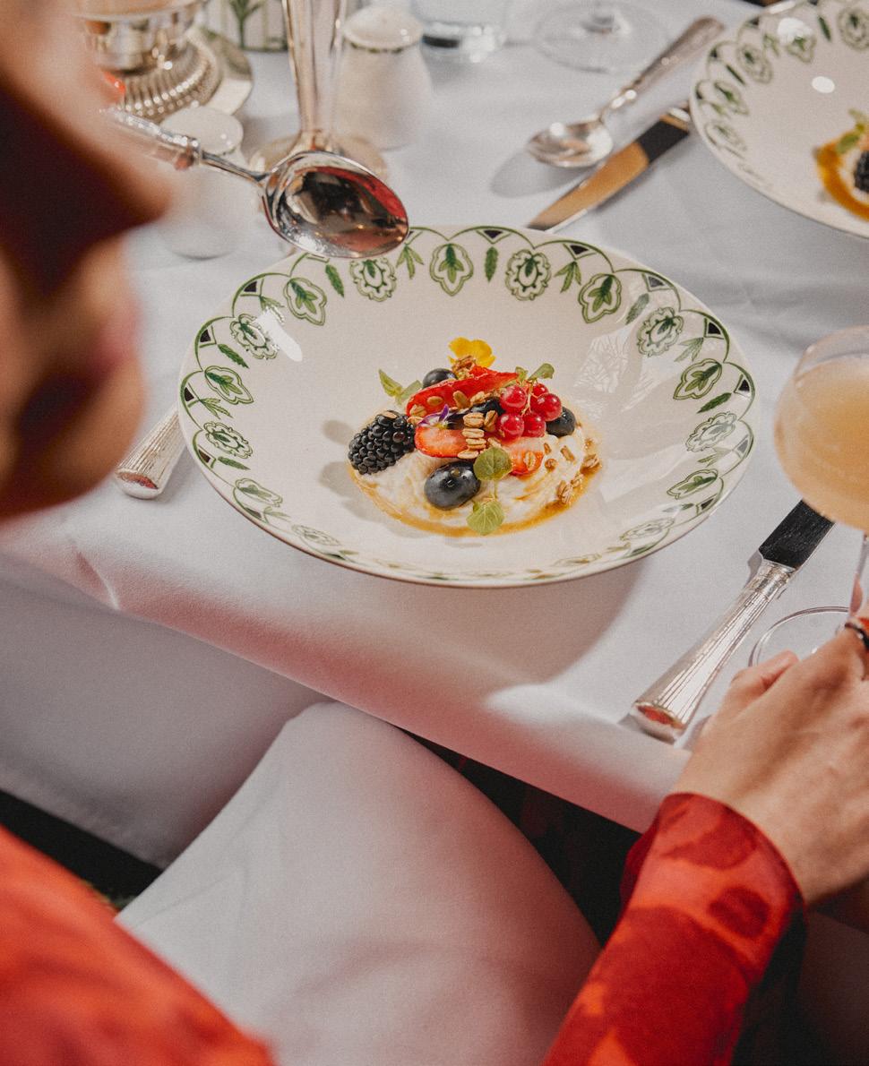 Crossing the Thames at Battersea in southwest London, a sumptuous multi-course brunch is served by the train’s hugely knowledgeable and smartly liveried stewards. The mouth-watering aroma of freshly baked pastries wafts through the gently rocking carriages; they arrive at the table warm and laced with seasonal fruit. The aptly named ‘Battersea brunch bowl’ swiftly follows, filled with juicy berries, crunchy granola, creamy whipped yoghurt, and a tangy tangerine syrup.